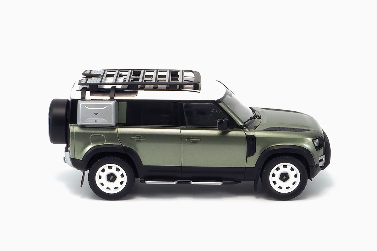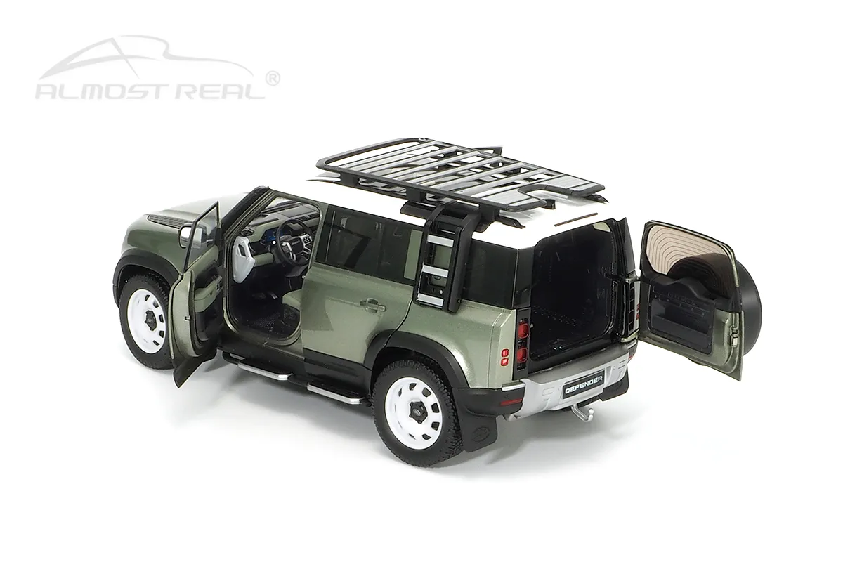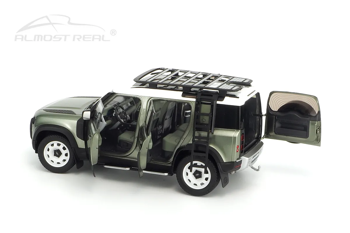 This Land Rover Defender 110 is a 1:18 scale miniature car, manufactured by Almost Real. It is presented in a Pangea Green color and comes with a pack including a roof rack and ladder. In addition, this miniature car has functional openings such as doors, engine hood and trunk.