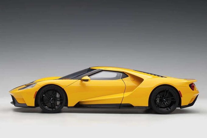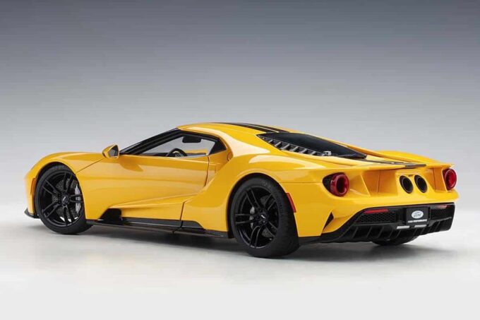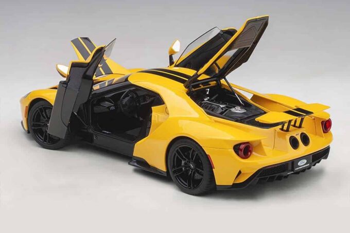 The iconic Ford supercar is reproduced at 1:18 scale by AUTOart in a yellow livery with black stripes. This modelcar has a mobile spoiler and many openings: doors, trunk and bonnet. The wheels are directional.