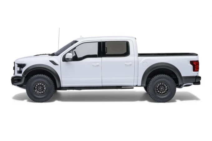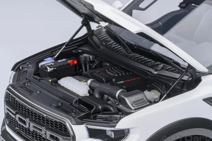 This 1:18 scale miniature reproduces the 2019 Ford F-150 Raptor Supercrew in Oxford White. Crafted by AUTOart in composite with functional opening parts, this model faithfully captures the imposing proportions of the American performance pickup. The 2019 Raptor features a 3.5-liter EcoBoost V6 producing 450 horsepower, launching this behemoth from 0 to 60 mph in just 5.1 seconds.