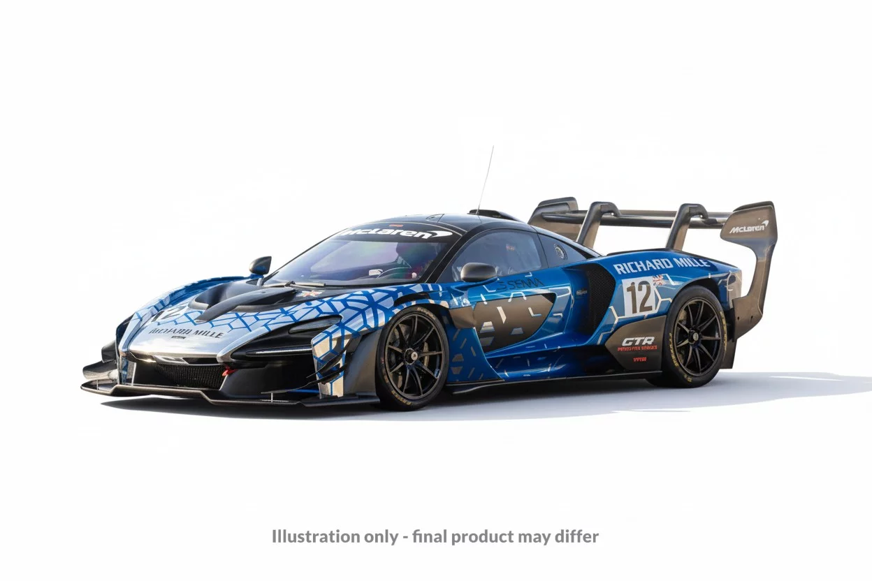 This 1:18 scale miniature car reproduces the McLaren Senna GTR in its blue presentation livery with number 12. Made by AUTOart, this miniature model is made of composite and has two opening parts.