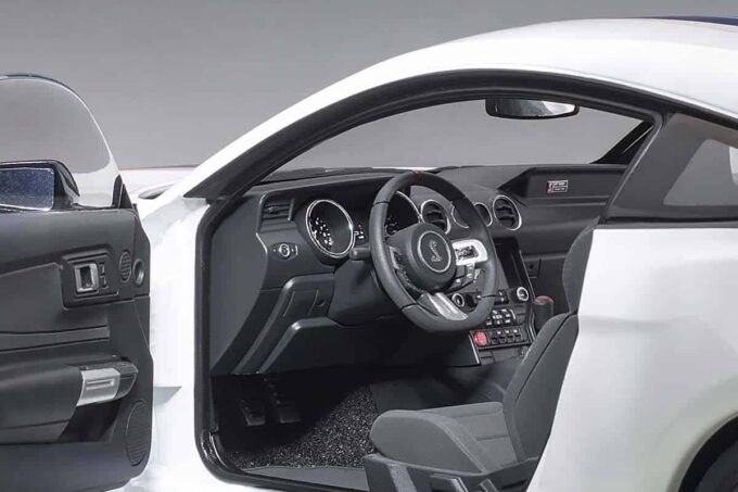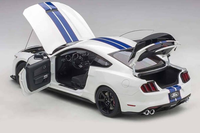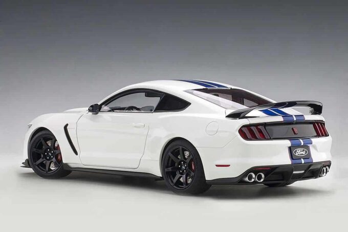 This Ford Mustang Shelby GT350R is reproduced in white with blue stripes at the smallest detail at 1:18 scale: directional wheels and openable parts allows you to admire the cabin, the trunk and the engine faithfully modeled. An exceptional miniature made by AUTOart.