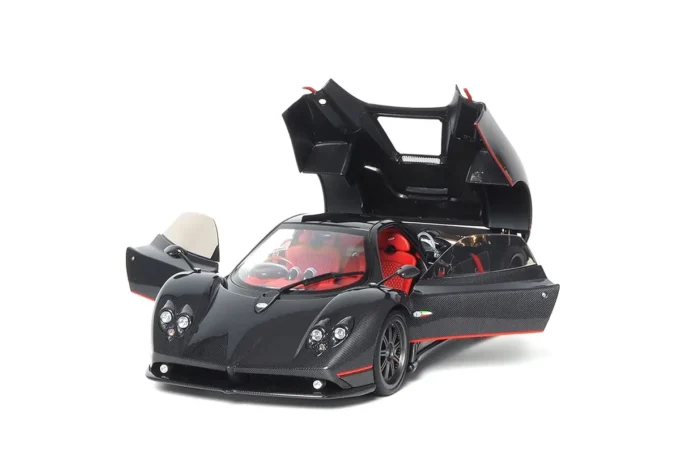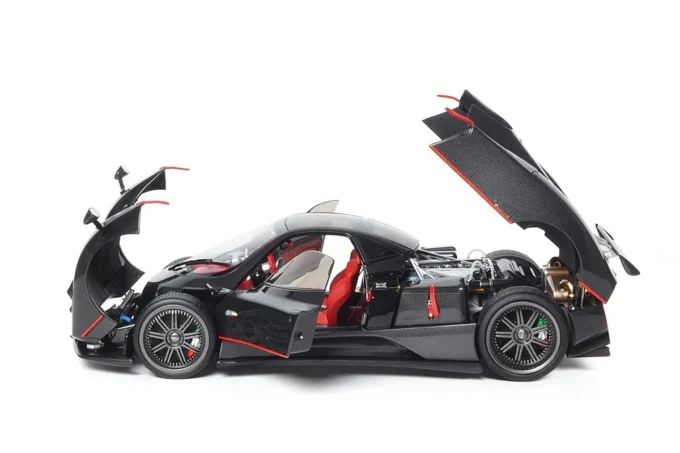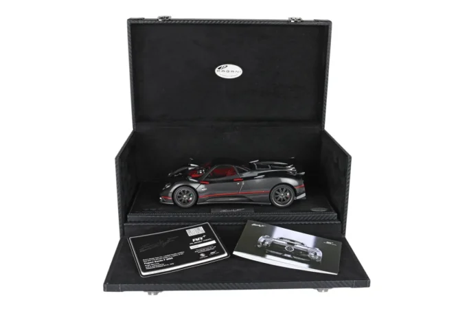Made of metal at 1:18 scale, this Pagani Zonda F features a glossy black carbon finish with a striking red stripe. Created by BBR in collaboration with Almost Real, it includes opening parts, working suspensions, and exclusive details such as machined aluminum and steel components. Presented on a base with a display case and luxury packaging.