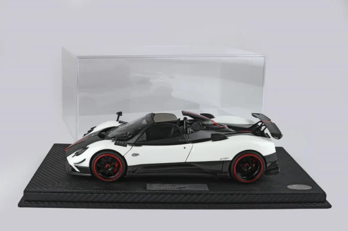 This Pagani Zonda Cinque Roadster in Benny White is a 1:18 scale masterpiece crafted in metal by BBR in collaboration with Almost Real. With opening parts and incredibly realistic details, including working suspensions and laser-cut leather hood closures, this model is an exceptional piece. Delivered with a base, display case, and luxury box, it is sure to captivate the most discerning collectors.