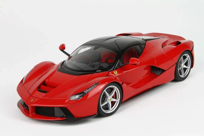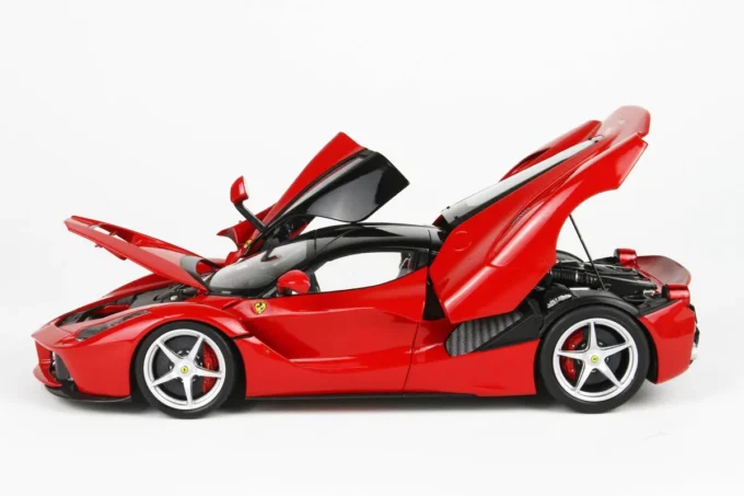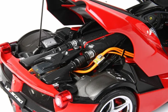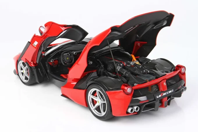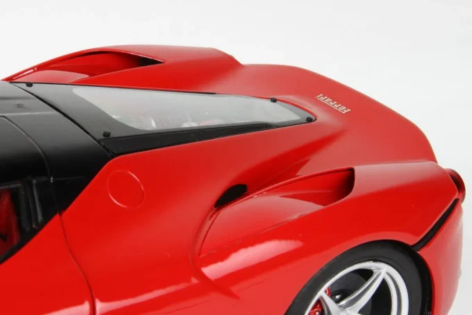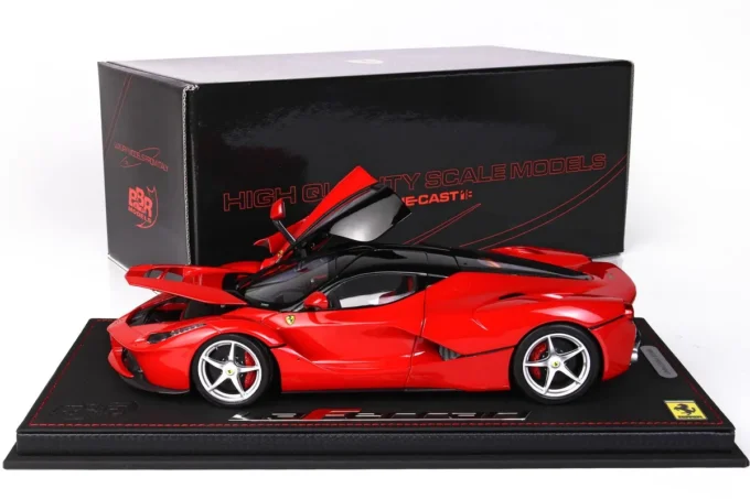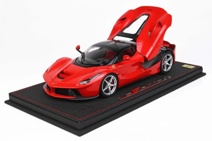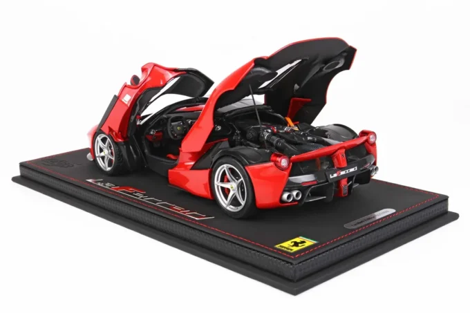 This 1:18th scale miniature car reproduces the Ferrari LaFerrari in a Corsa 322 red color. Manufactured by BBR, this scale model is made of metal. Some parts are openable. Miniature produced in a limited series of only 499 copies.