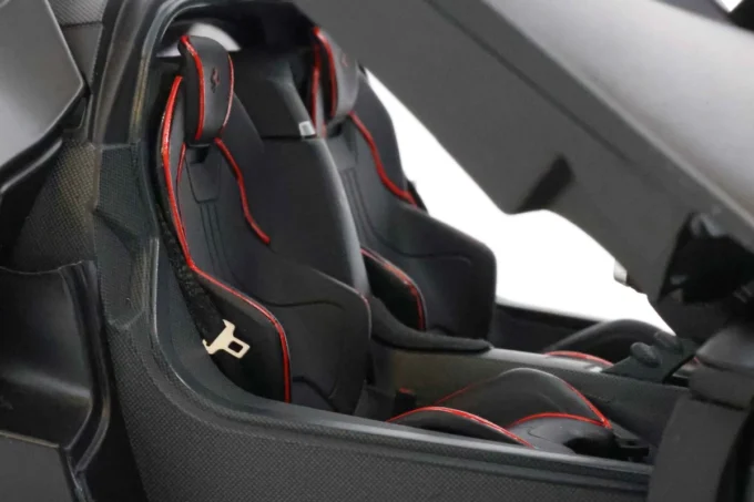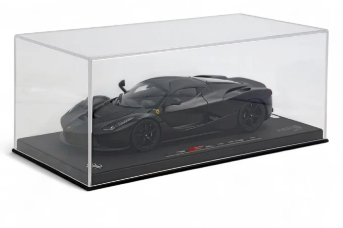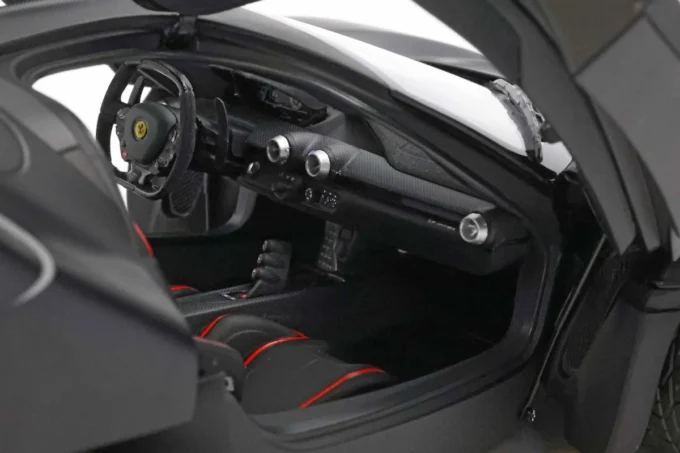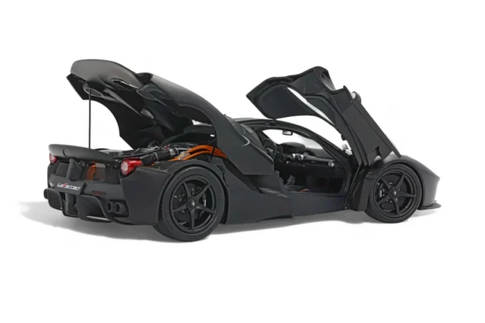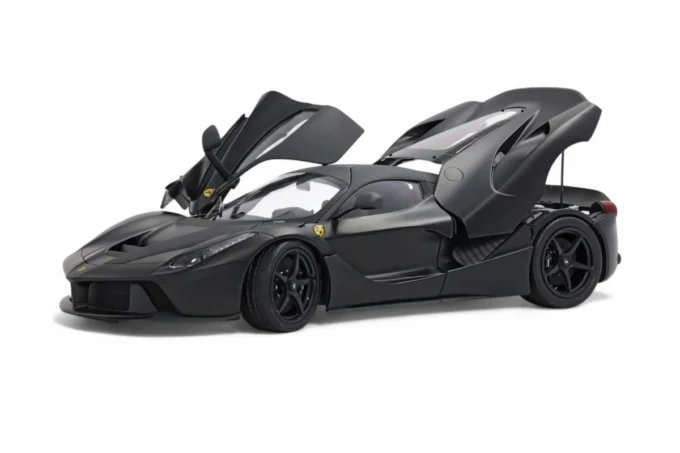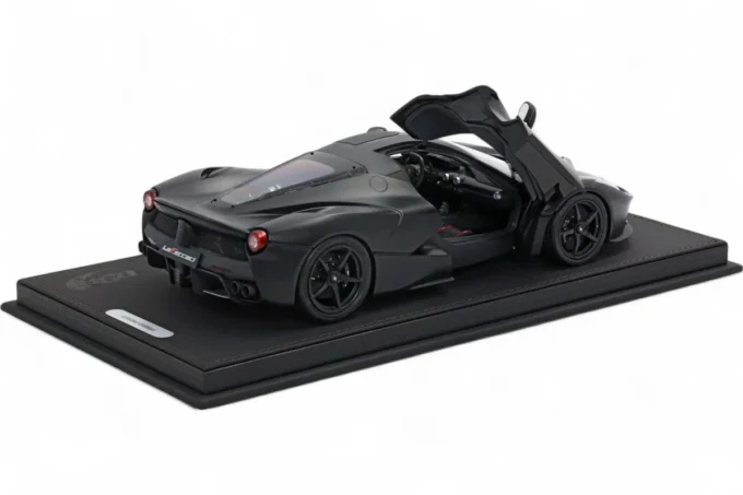 The 1:18 scale Ferrari LaFerrari in matte black with black wheels. Manufactured in metal by BBR with functional openings, this ultra-limited edition of 78 examples represents the hybrid hypercar that defined its era. The 6.3-liter V12 develops 789 hp while the KERS electric motor adds 161 hp for a total of 950 hp. As Ferrari's first production hybrid model, the LaFerrari marked the manufacturer's entry into the electrification era. Delivered with base and display case.