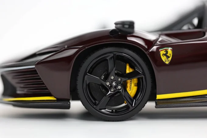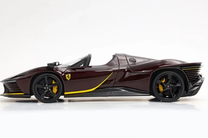 This 1:18 scale miniature car reproduces the Ferrari Daytona SP3 in Ruby Red with yellow accents (open roof). Manufactured by BBR, this model is made of resin. Limited edition of 79 numbered pieces.