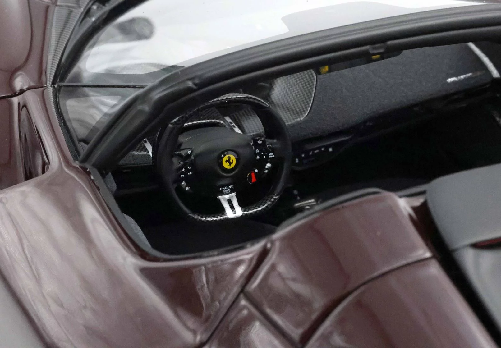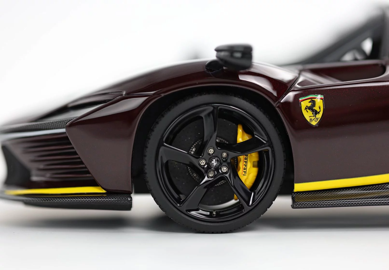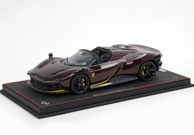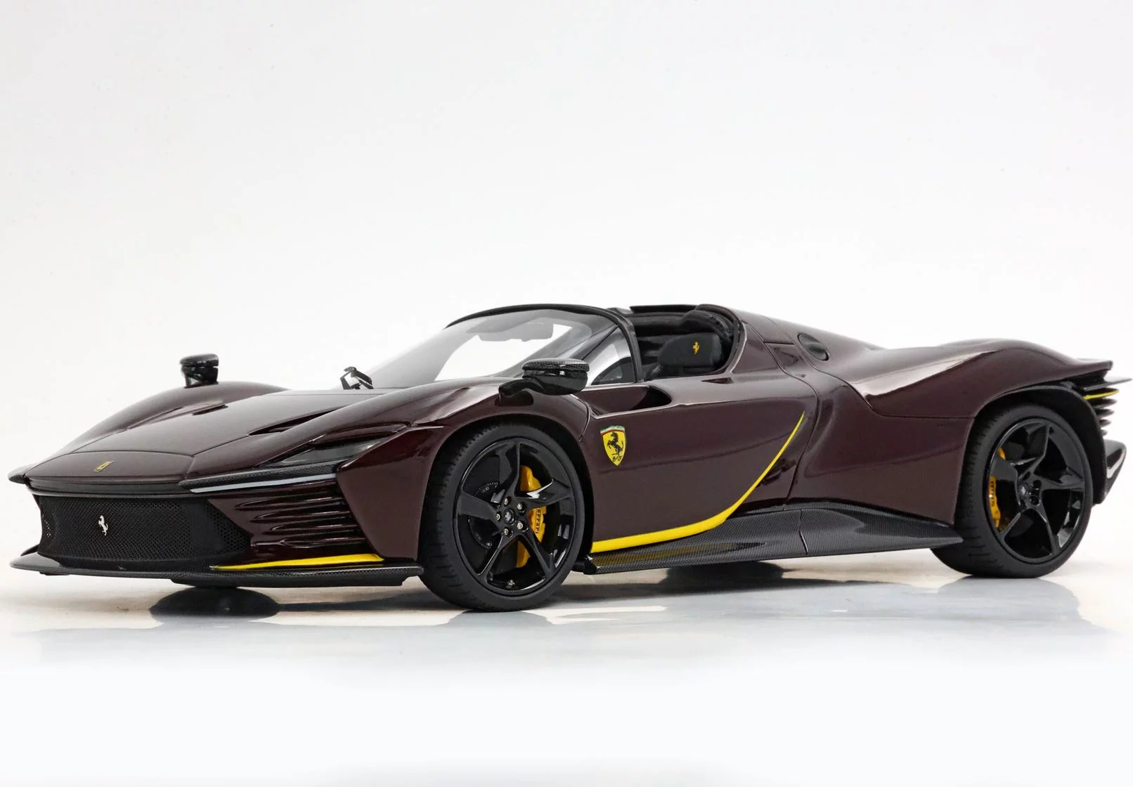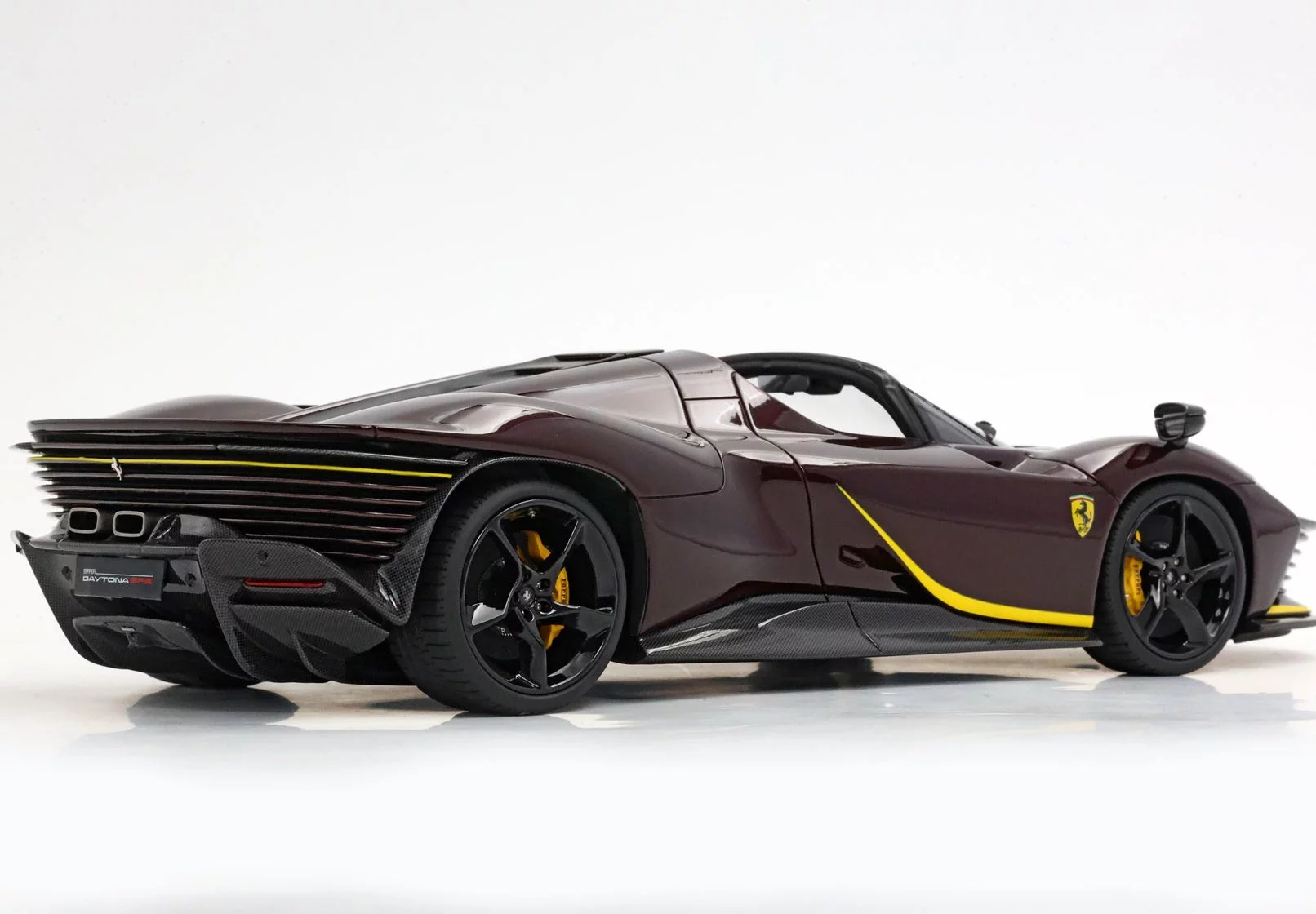 This 1:18 scale miniature car reproduces the Ferrari Daytona SP3 in Ruby Red with yellow accents (open roof). Manufactured by BBR, this model is made of resin. Limited edition of 79 numbered pieces.