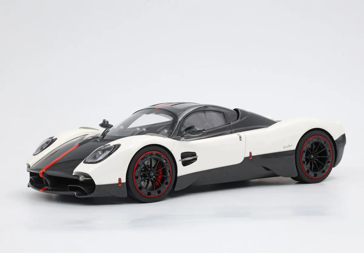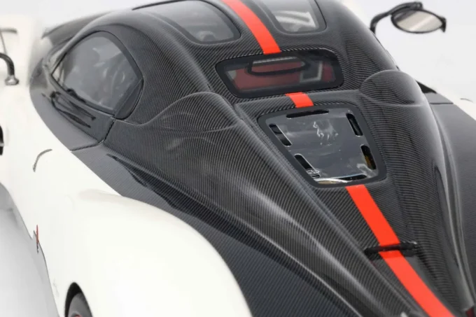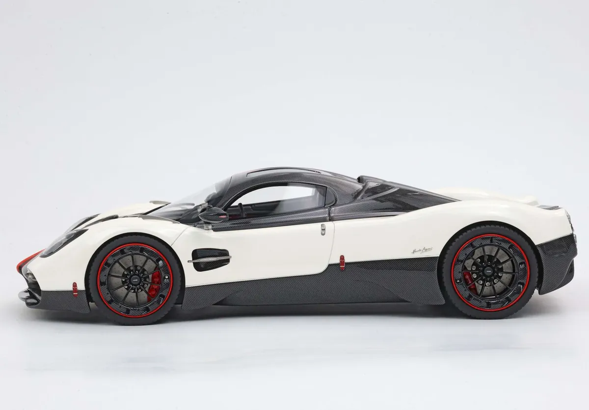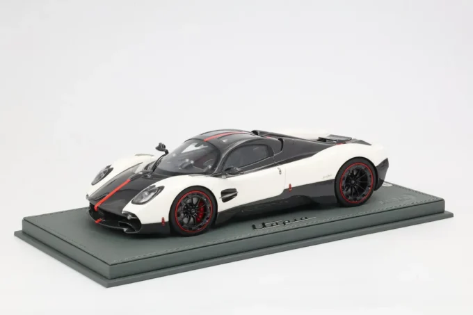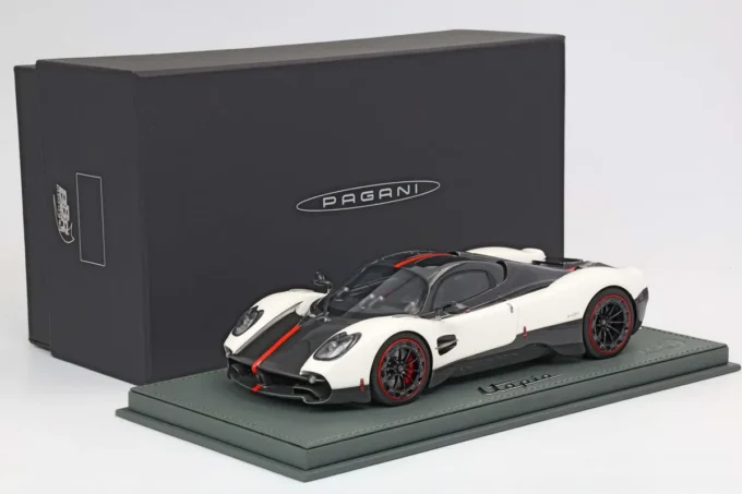This 1:18 scale Pagani Utopia, made of resin by BBR, stands out with its Benny white color accented with carbon fiber and a red stripe, reminiscent of the iconic Zonda Cinque livery. Limited to 50 pieces, this model comes with a base. The Utopia embodies the quintessence of Pagani's craftsmanship and innovation, blending performance with distinctive design.