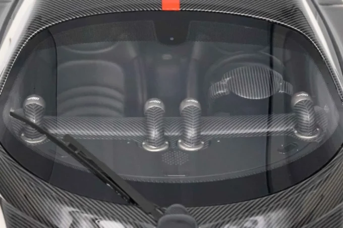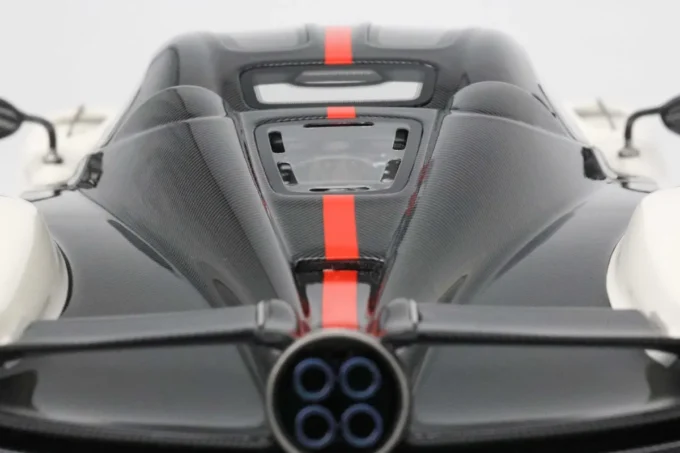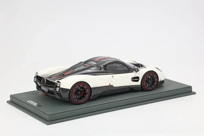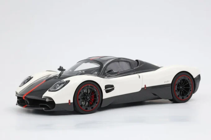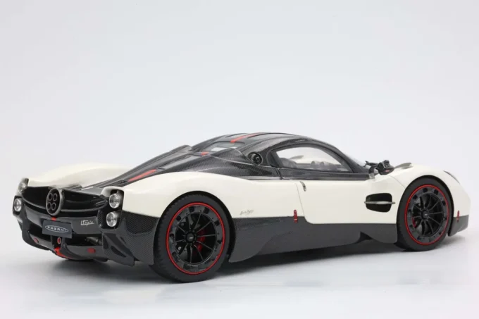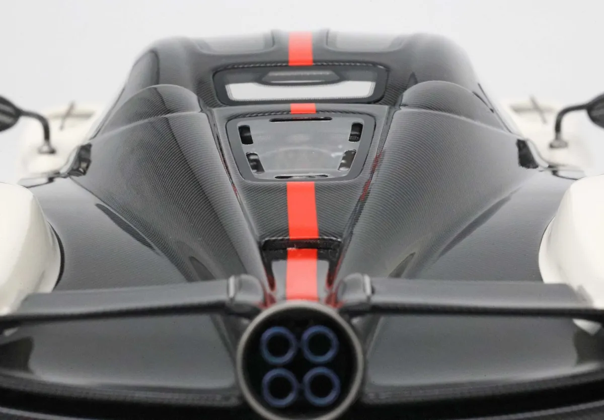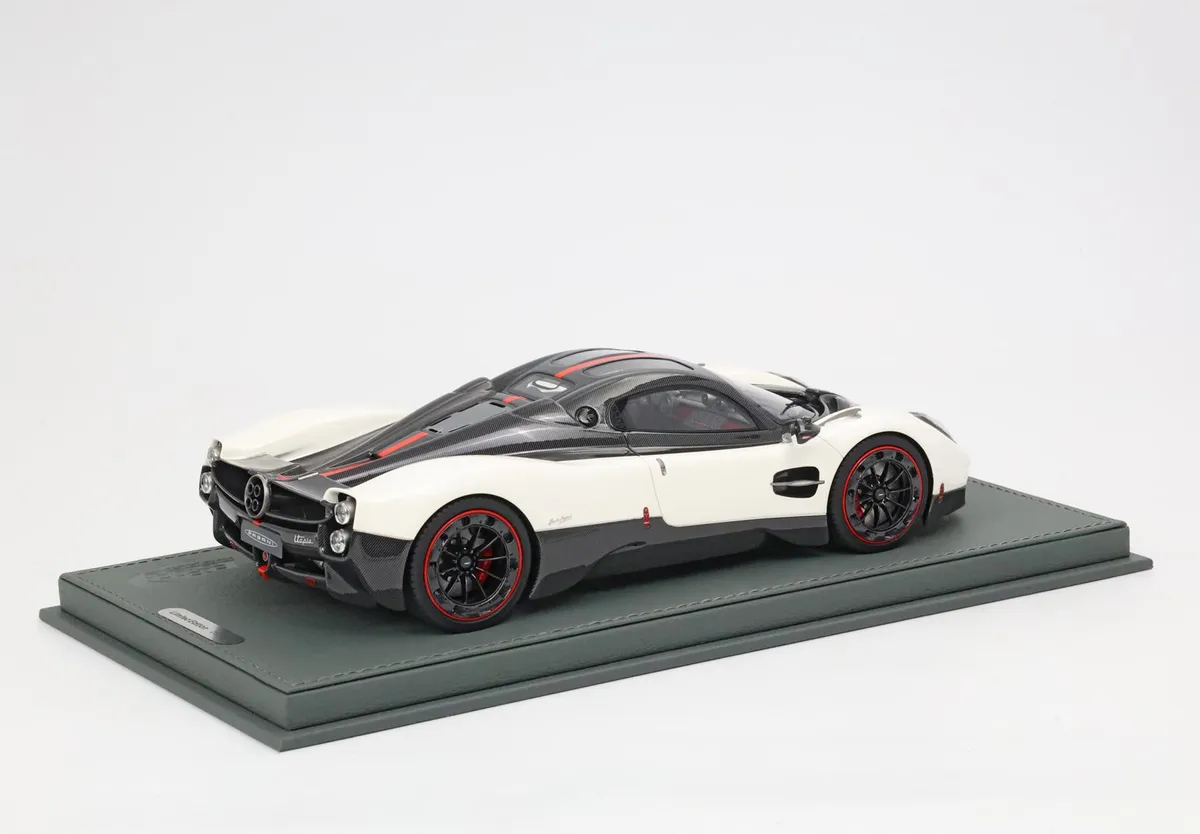 This 1:18 scale Pagani Utopia, made of resin by BBR, stands out with its Benny white color accented with carbon fiber and a red stripe, reminiscent of the iconic Zonda Cinque livery. Limited to 50 pieces, this model comes with a base. The Utopia embodies the quintessence of Pagani's craftsmanship and innovation, blending performance with distinctive design.