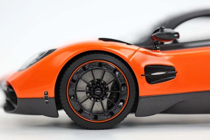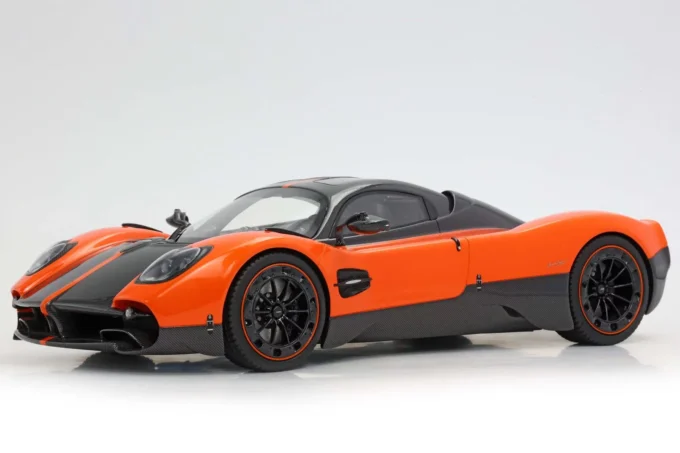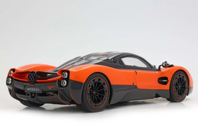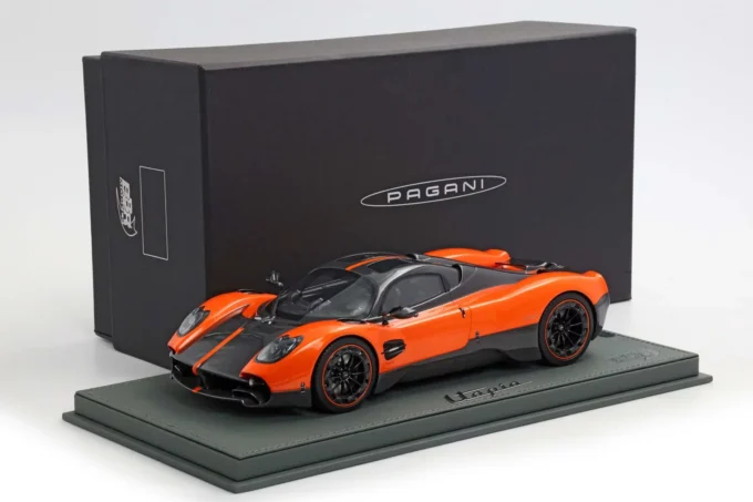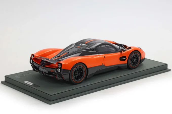 The Pagani Utopia is reborn at 1:18 scale in this BBR resin interpretation, dressed in sumptuous Marbella orange that enhances its flowing curves. This limited series reproduction, accompanied by its refined base, celebrates the hypercar that weighs only 1,280 kg despite its imposing Mercedes-AMG twin-turbo V12. Only 99 Utopia coupés were produced, all already sold, making this miniature a privileged witness to absolute automotive exclusivity.