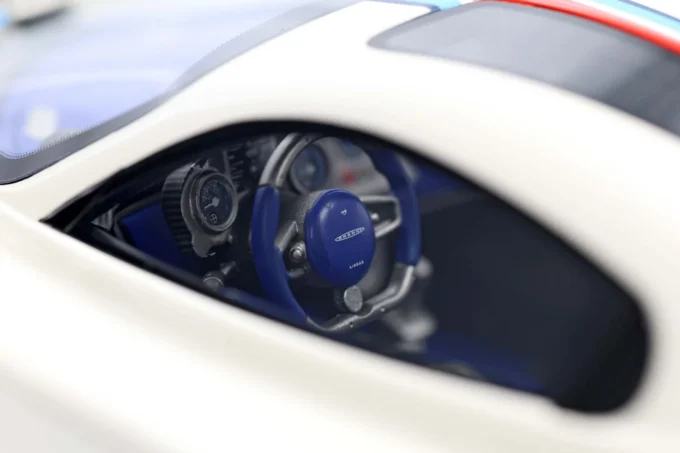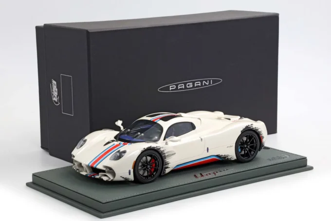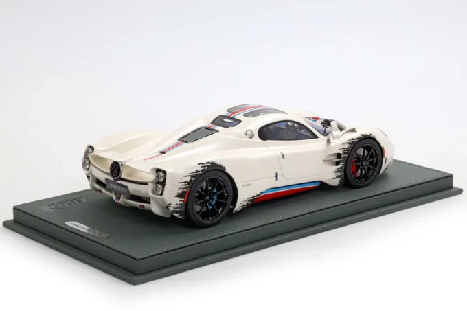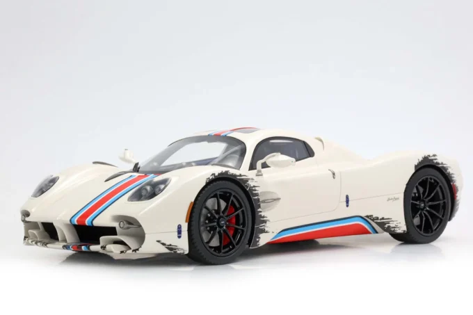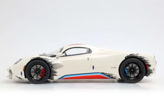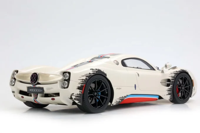 This 1:18 scale Pagani Utopia displays the exclusive "The Coyote" livery enhanced with race-inspired stripes in Rosso Monza, blue and turquoise over Bianco Benny base. Crafted by BBR in resin and presented on base, this limited series replica faithfully reproduces a unique configuration that the Italian marque masters down to the smallest details. The Utopia uses over forty different composite material formulas, revolutionizing the art of carbon fiber in automotive design.