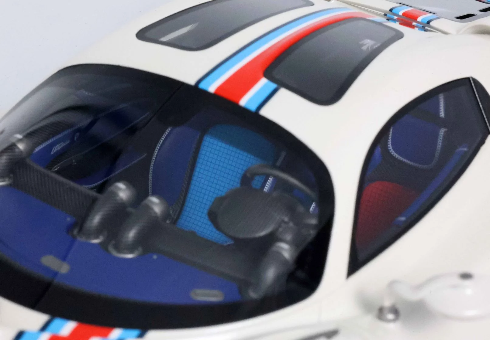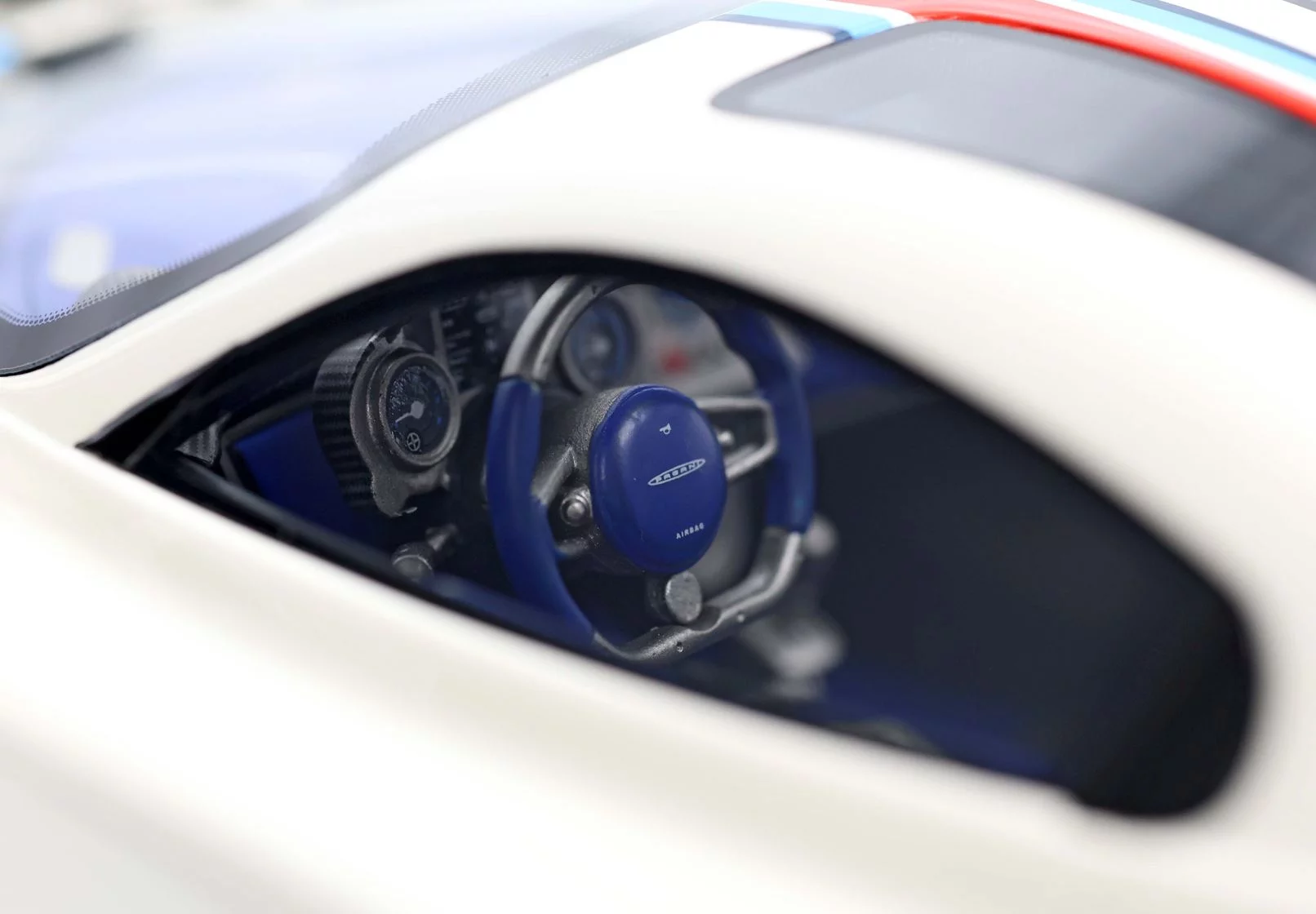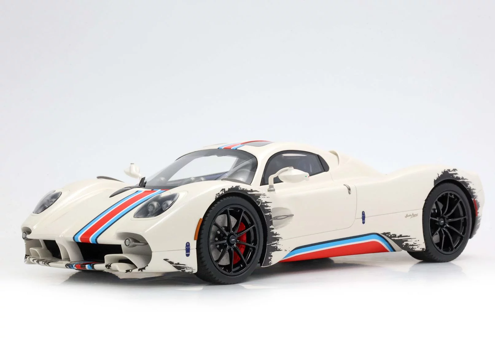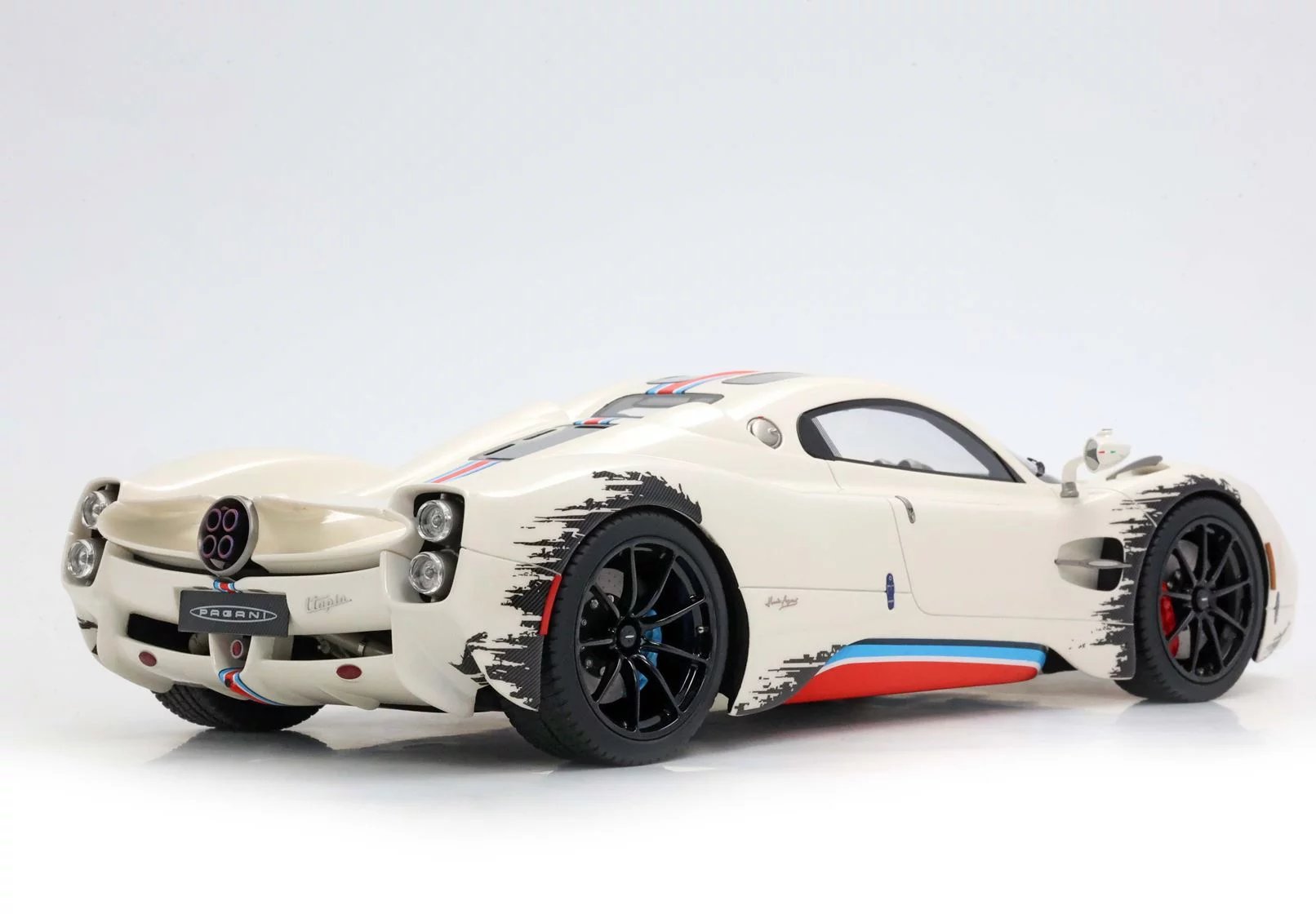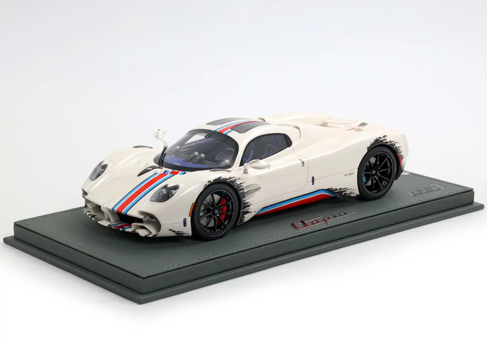 This 1:18 scale Pagani Utopia displays the exclusive "The Coyote" livery enhanced with race-inspired stripes in Rosso Monza, blue and turquoise over Bianco Benny base. Crafted by BBR in resin and presented on base, this limited series replica faithfully reproduces a unique configuration that the Italian marque masters down to the smallest details. The Utopia uses over forty different composite material formulas, revolutionizing the art of carbon fiber in automotive design.