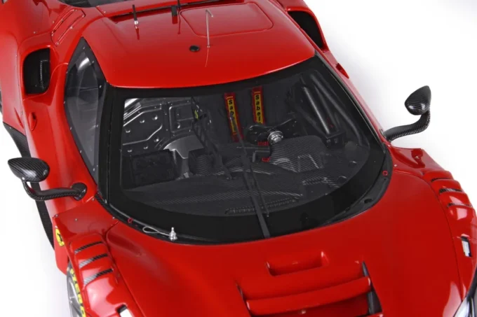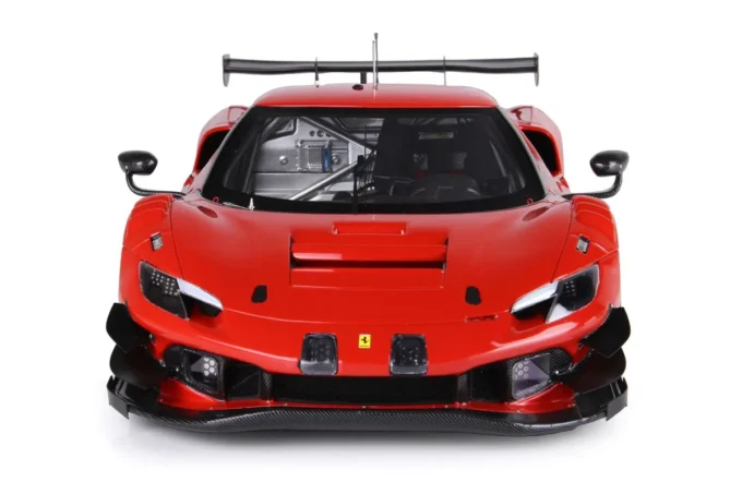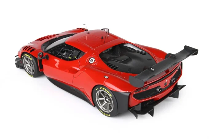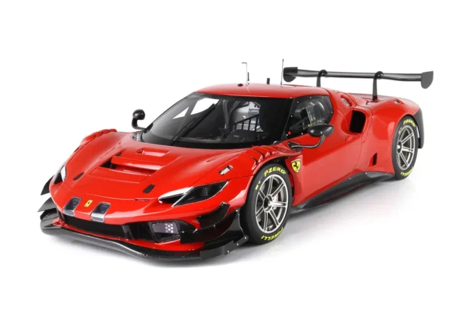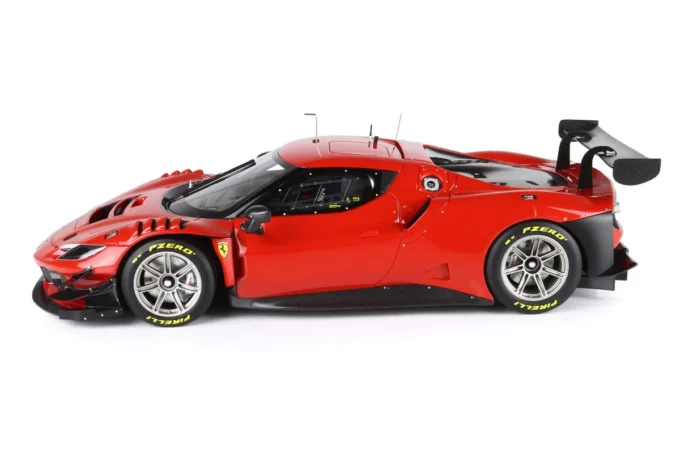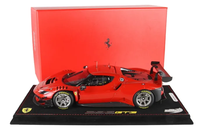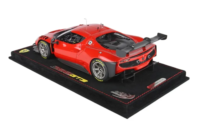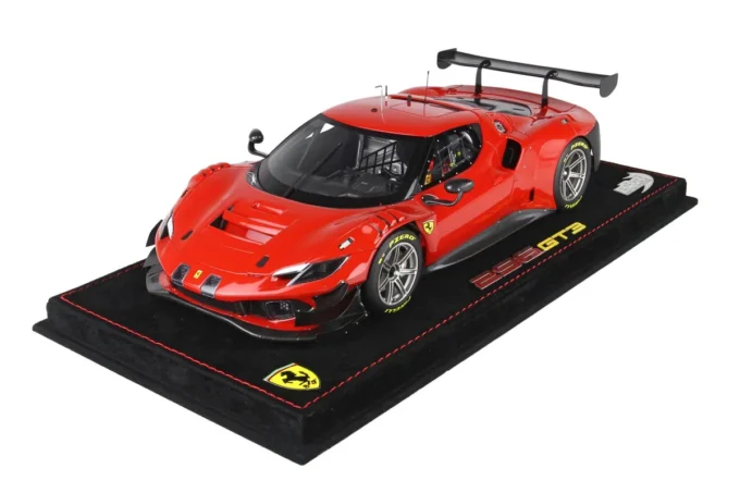 The 1:18 scale Ferrari 296 GT3, manufactured by BBR, captivates with its Magma Red color. This limited edition of only 46 numbered pieces celebrates the sportiness and incomparable style of the prancing horse brand. Presented on a base, this miniature captivates the eye with its racing allure.