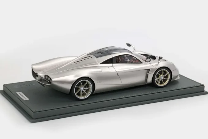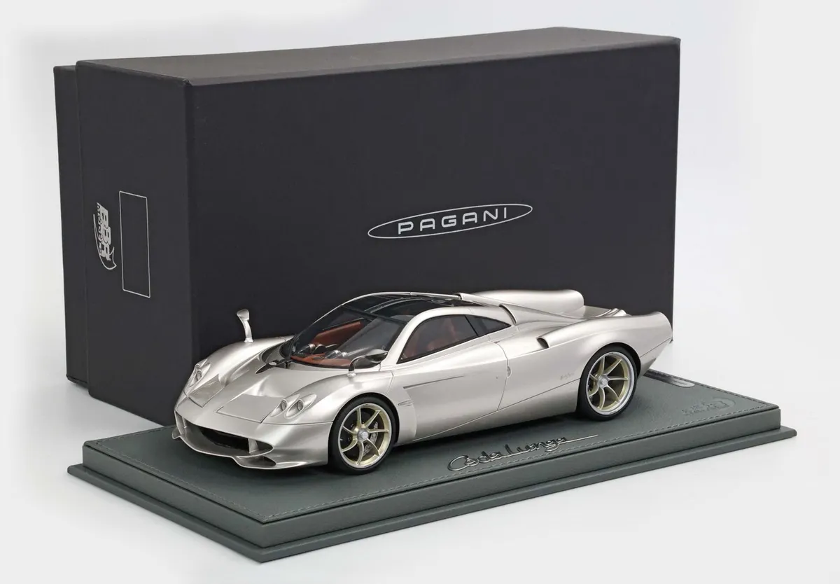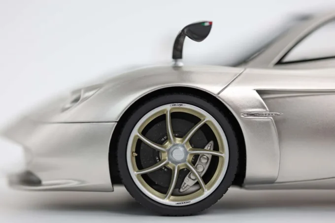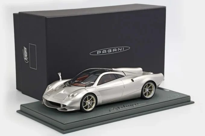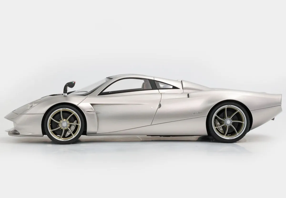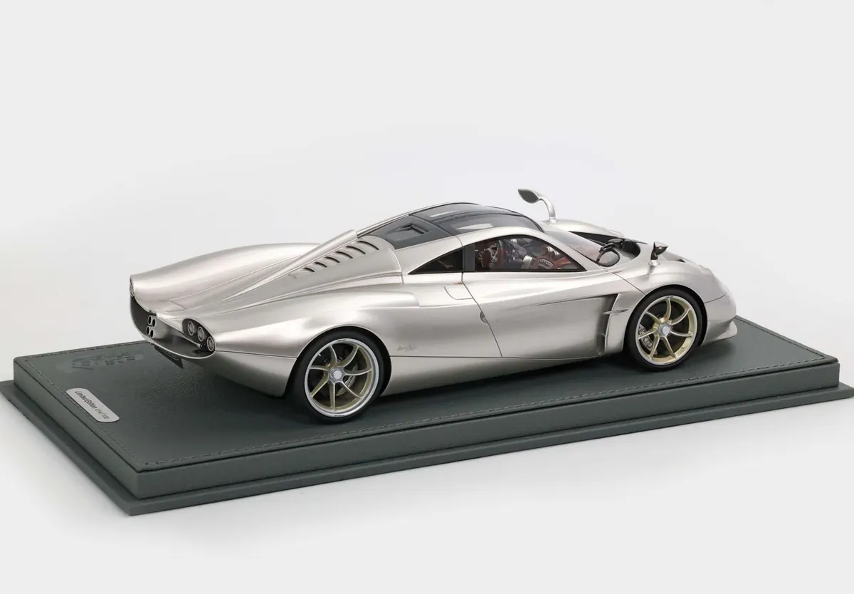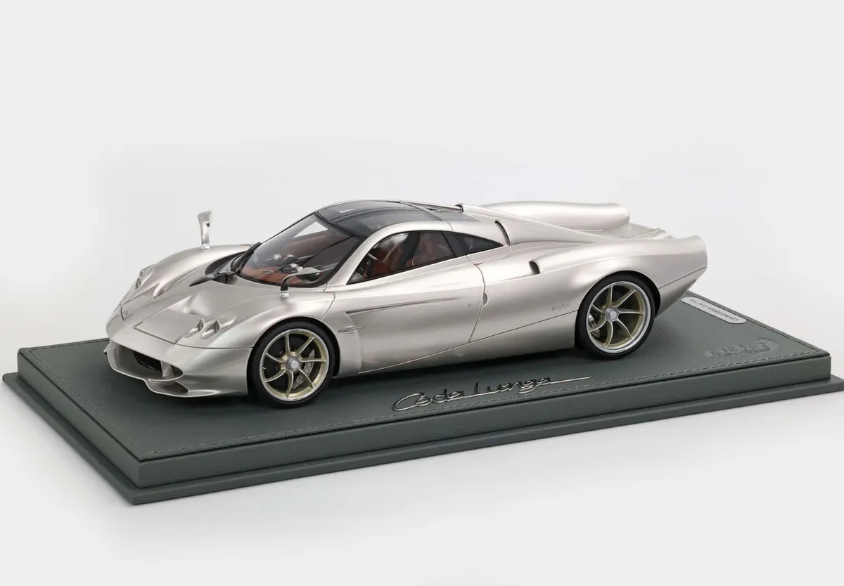 The 1:18 scale Pagani Huayra Codalunga, made of resin by BBR, features a Porsche Gold Bronze color. Limited to 200 pieces, this model comes with a base. The Huayra Codalunga stands out with its unique elongated design, inspired by the racing cars of the 1960s.