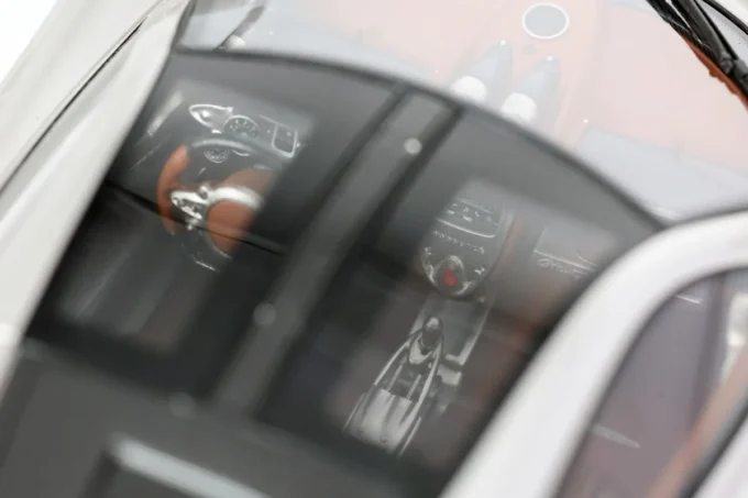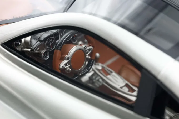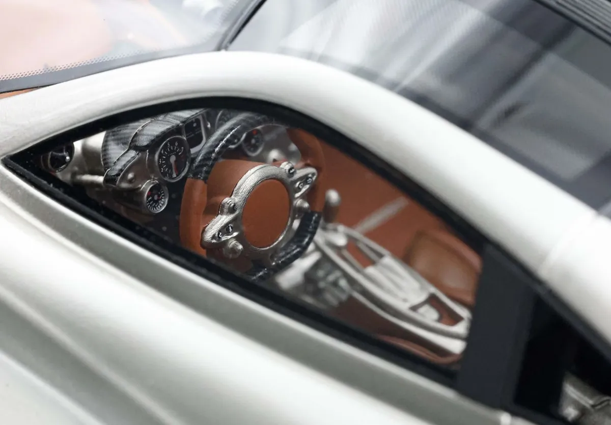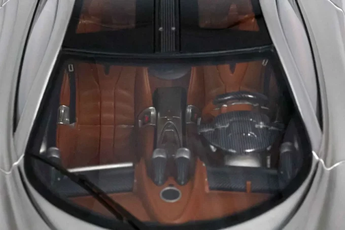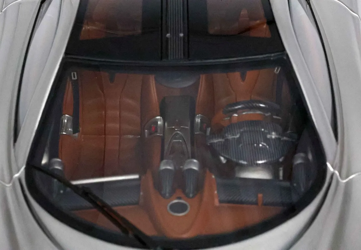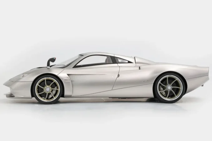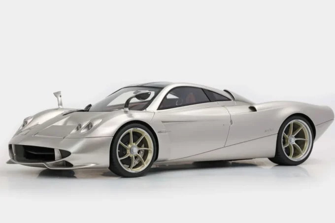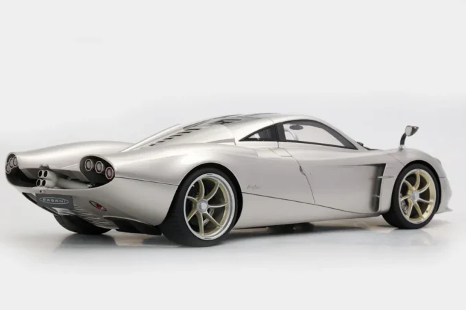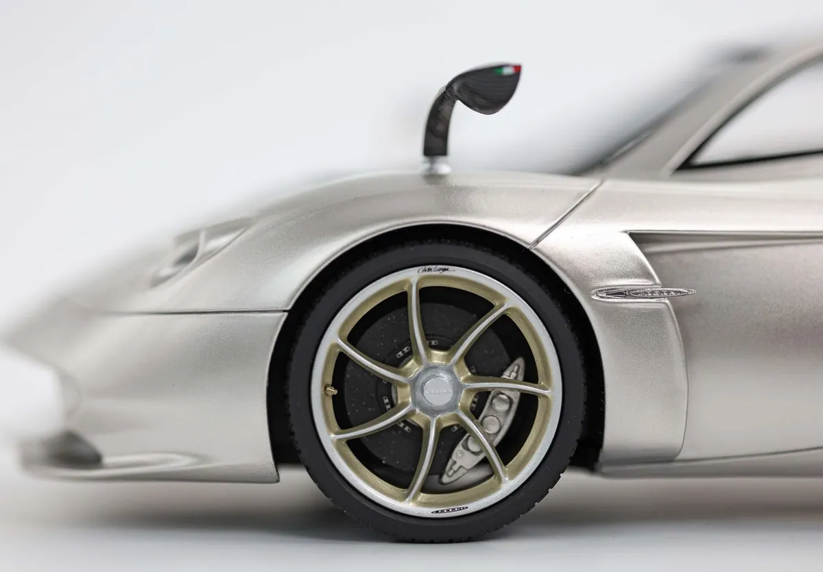 The 1:18 scale Pagani Huayra Codalunga, made of resin by BBR, features a Porsche Gold Bronze color. Limited to 200 pieces, this model comes with a base. The Huayra Codalunga stands out with its unique elongated design, inspired by the racing cars of the 1960s.