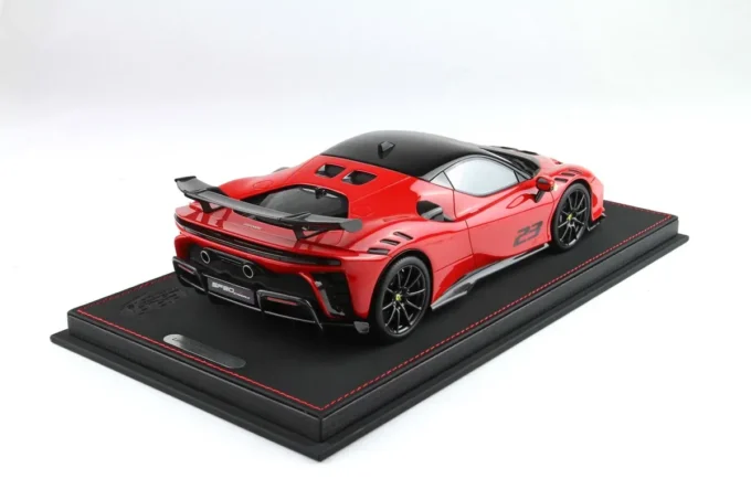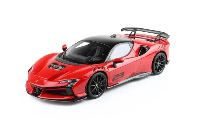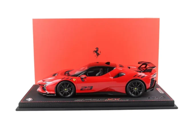 This 1:18th scale miniature car reproduces the Ferrari SF90 XX Stradale in a Corsa 322 red color and number 23. Manufactured by BBR, this scale model is made of resin. Miniature produced in limited series.