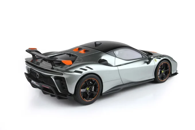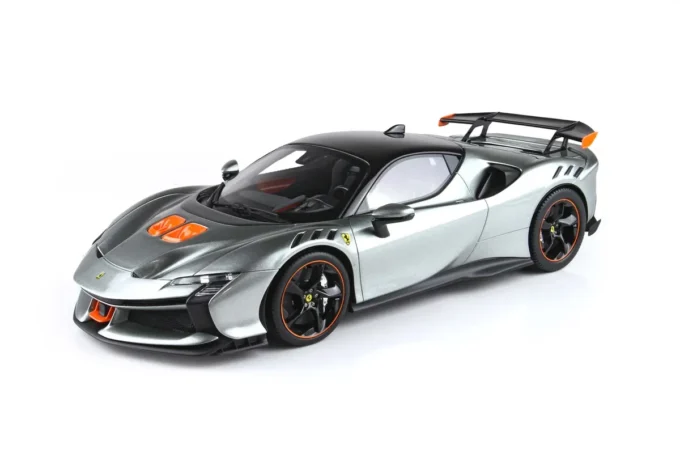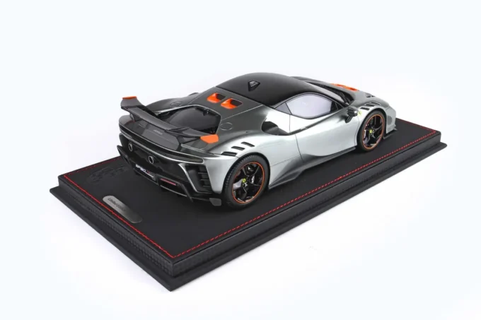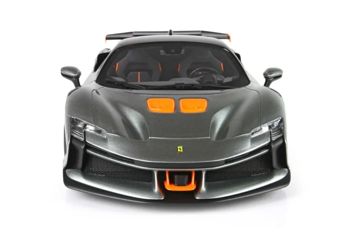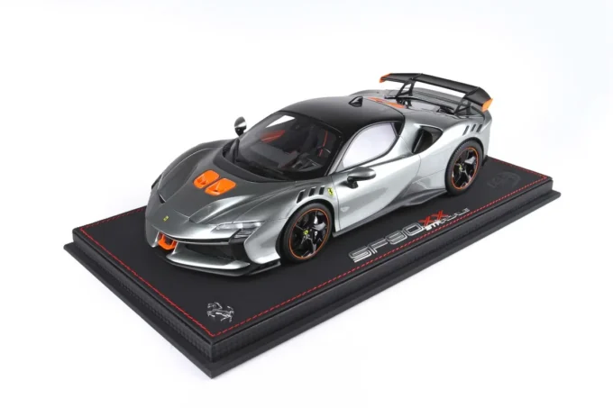 This 1:18th scale miniature car reproduces the Ferrari SF90 XX Stradale in a Competition gray color and orange accents. Manufactured by BBR, this scale model is made of resin. Miniature produced in a limited series of only 50 copies.