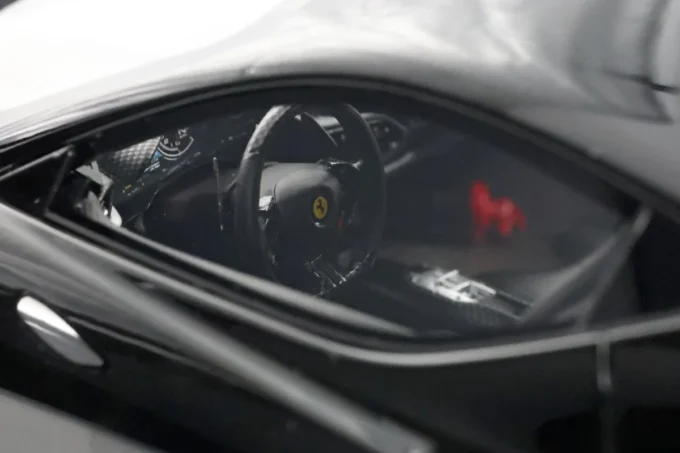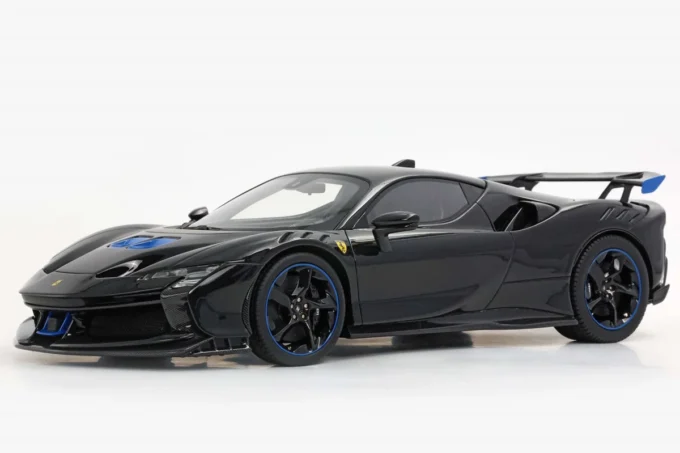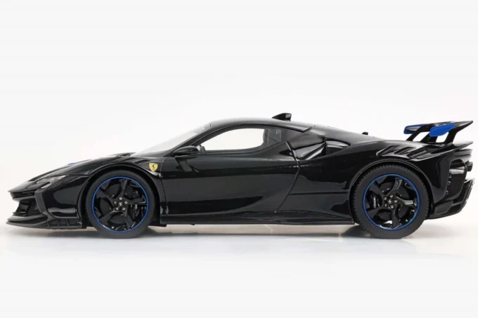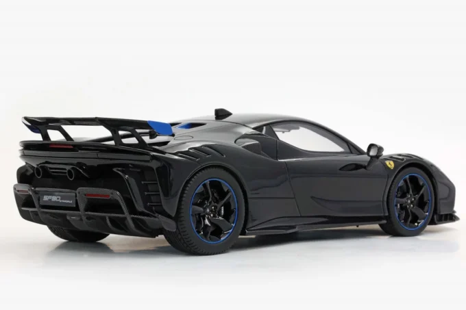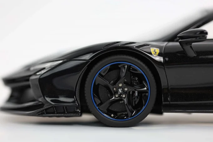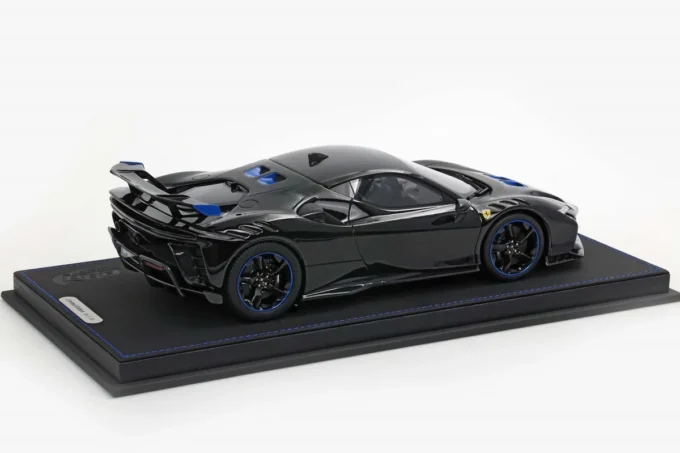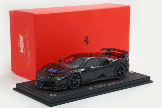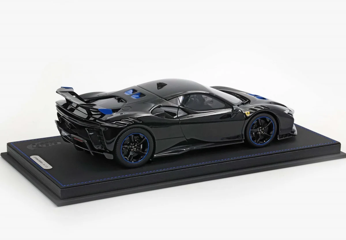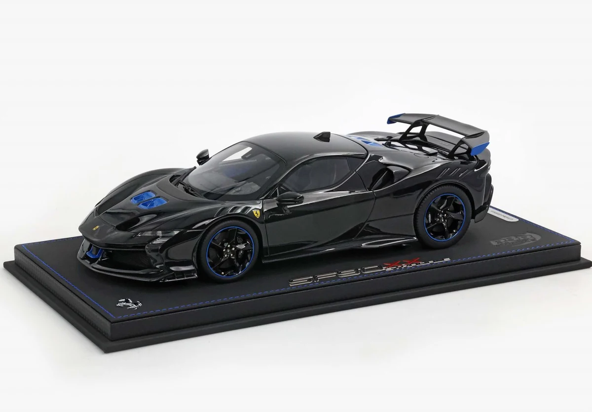 This 1:18 scale model of the Ferrari SF90 XX Stradale in New Black Daytona, crafted by BBR, is made of resin and part of a limited series of only 20 numbered pieces. Displayed on a base, it captures the elegance and power of this hybrid supercar. The SF90 XX Stradale combines Ferrari luxury with cutting-edge innovation, featuring a hybrid powertrain that delivers blistering acceleration.