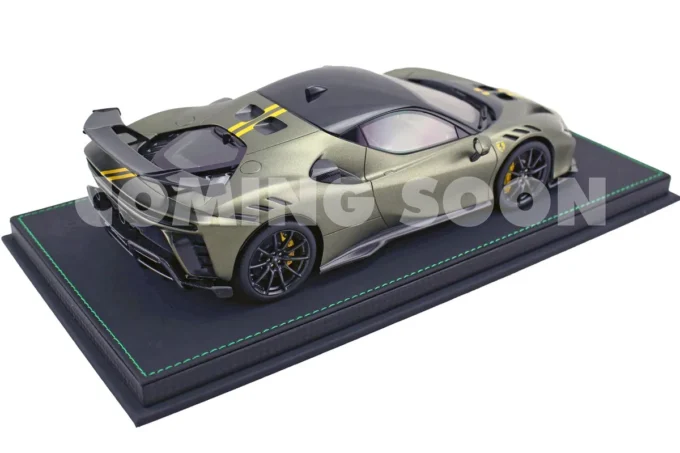 This 1:18 scale model of the Ferrari SF90 XX Stradale by BBR stands out with its stunning matte Masoni green finish with yellow stripes. Crafted in resin and produced in a limited series of only 20 numbered units, it features exquisite detailing and comes mounted on a display base. The Ferrari SF90 XX Stradale embodies the essence of racing, equipped with a hybrid V8 engine that delivers breathtaking performance.