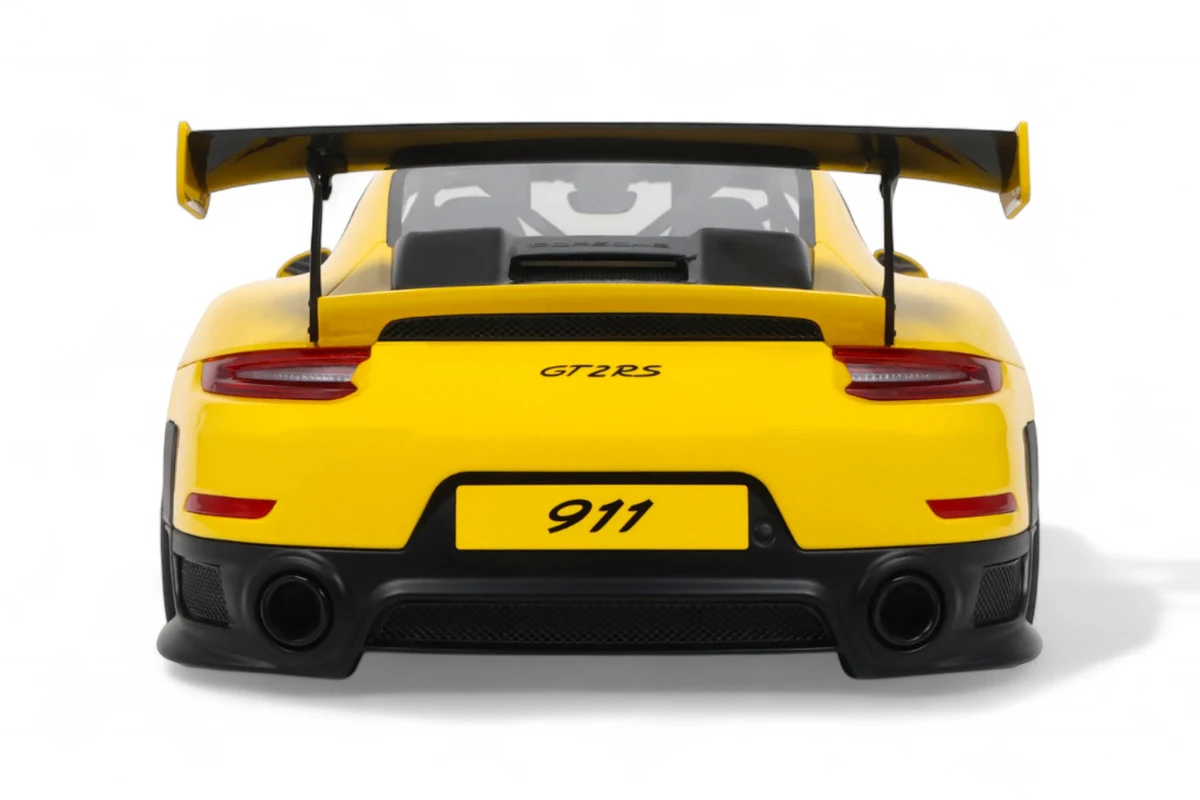 This yellow 1:12 scale Porsche 911 GT2 RS Weissach Pack (991.2) represents the most powerful road-going 911 ever produced. Crafted in resin by GT Spirit as a limited edition, it perfectly embodies the radical spirit of this model that holds the Nürburgring lap record for road-legal cars with a time of 6:47.25.