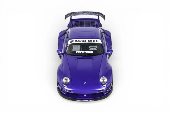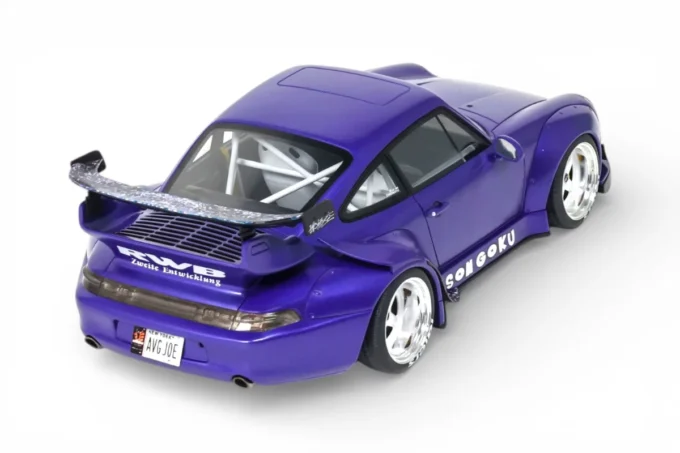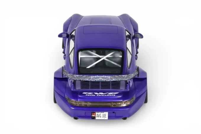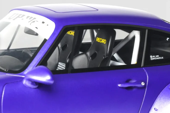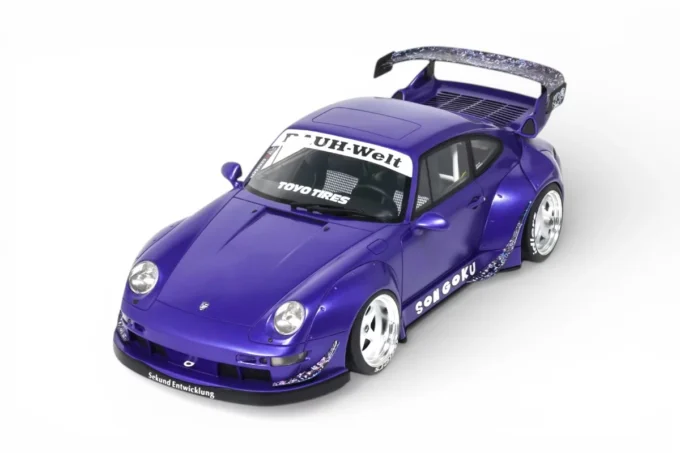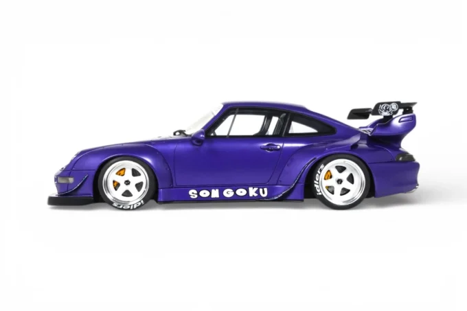 This 1:18 scale RWB Son Goku Porsche 911 is reproduced by GT Spirit in resin and finished in purple. RWB (Rauh-Welt Begriff) is the Japanese workshop of Akira Nakai, known for its hand-shaped and fitted flared body kits based on the Porsche 911. Son Goku, the central character of Dragon Ball, lends his name to this creation in 2024. Limited edition model, mounted on a base.