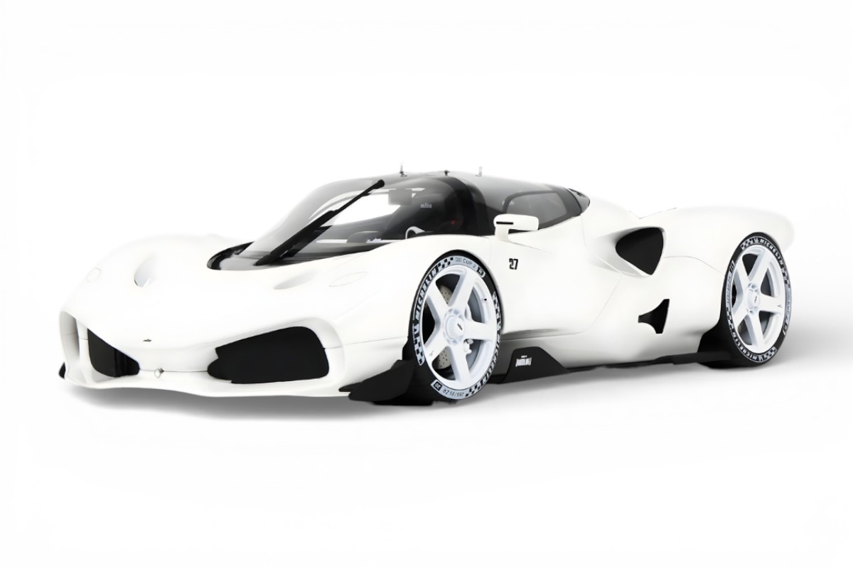 This 1:18 scale Nilu27 NILU features immaculate white coloring. Manufactured in resin by GT Spirit in limited series, it pays tribute to the analog hypercar designed by Sasha Selipanov. The 6.5-liter naturally aspirated V12 engine develops 1,070 horsepower at 11,000 rpm and pairs with a seven-speed open-gate manual transmission, reaffirming the purist philosophy against electrification.
