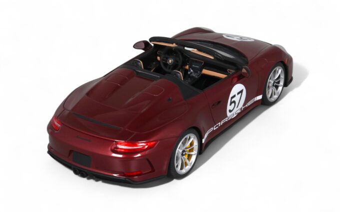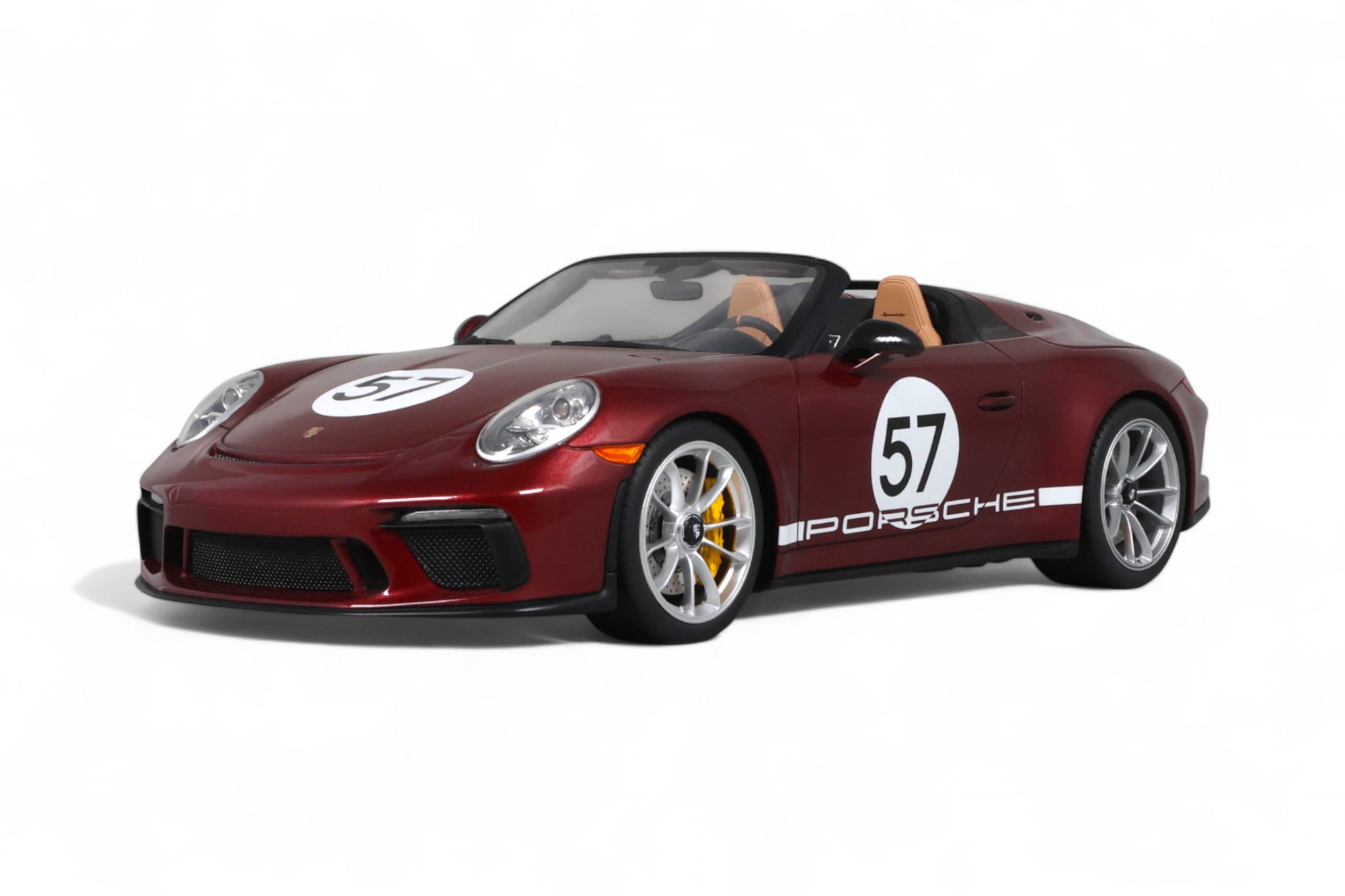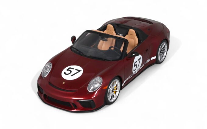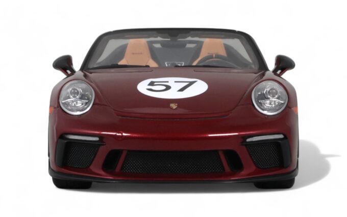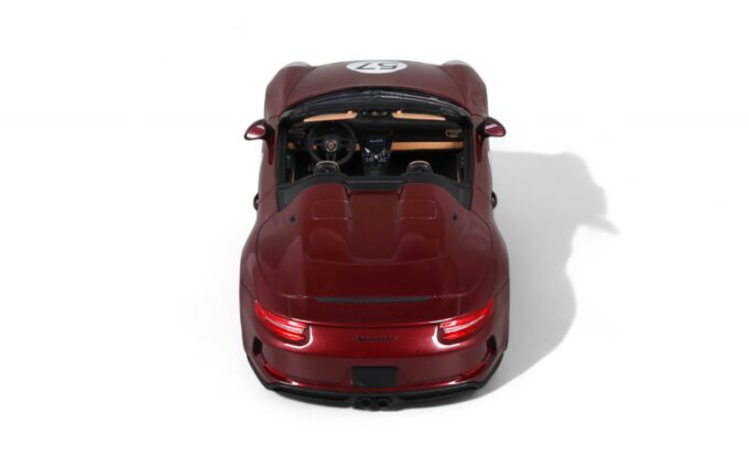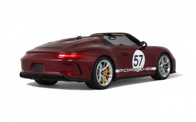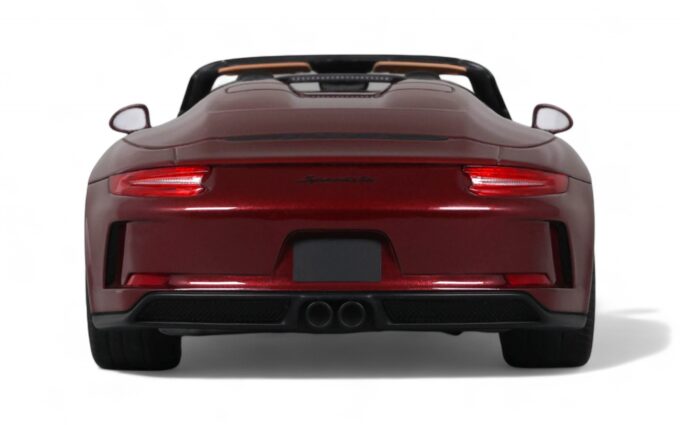 This 1:18 scale Porsche 911 (991.2) Speedster Heritage Edition adorns itself with an elegant Cherry Metallic shade. Meticulously sculpted in resin by GT Spirit, this limited edition is enhanced on a distinguished base.