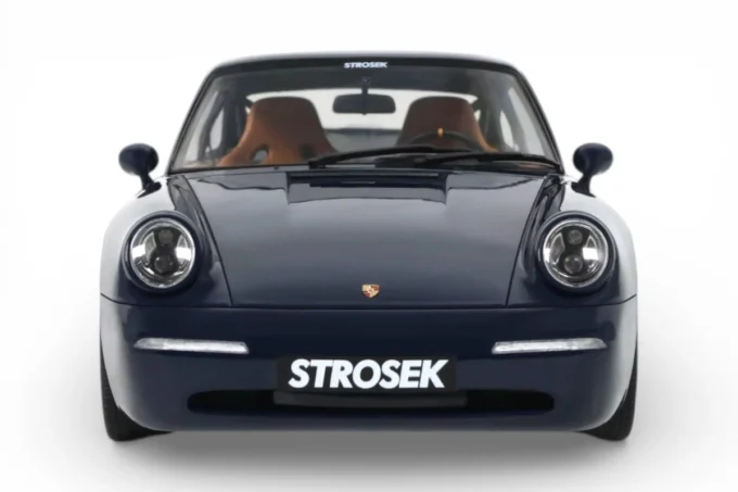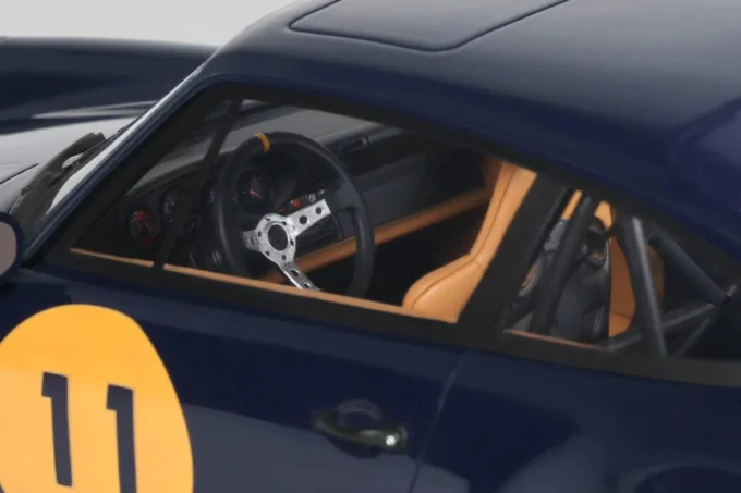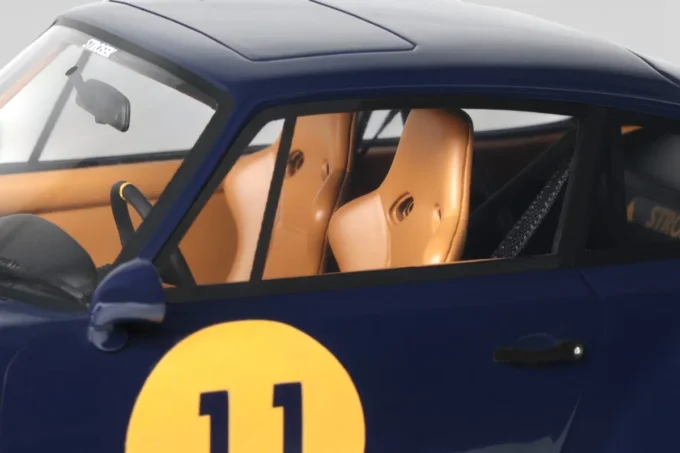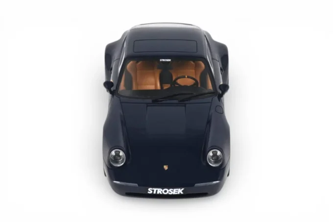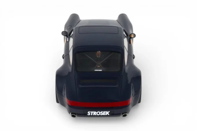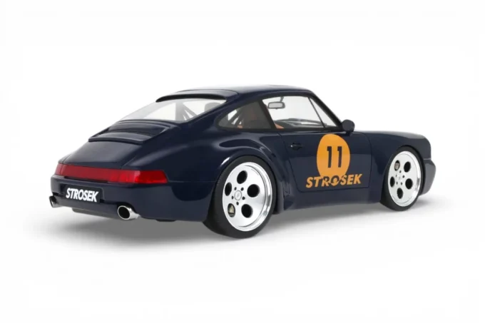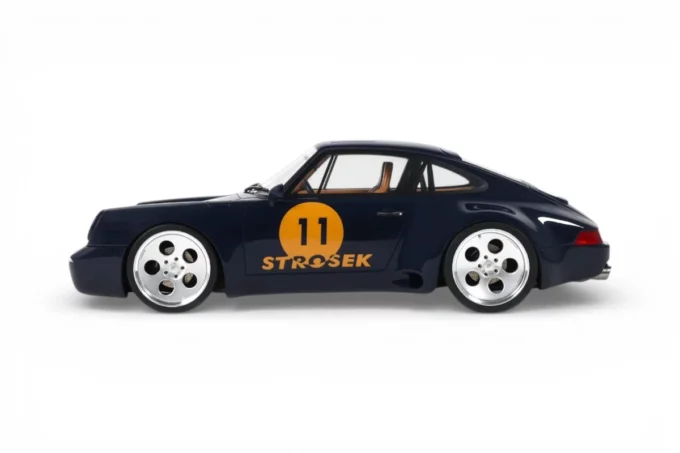This 1:18 scale Strosek Mega 30 features blue livery. Crafted in resin by GT Spirit in limited series, it celebrates the return of German tuner Vittorio Strosek. Based on the Porsche 964, the Mega 30 marks the 30th anniversary of the original design and exists in only 30 examples, each vehicle requiring 1,200 to 1,500 hours of restoration.