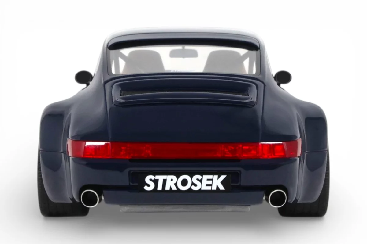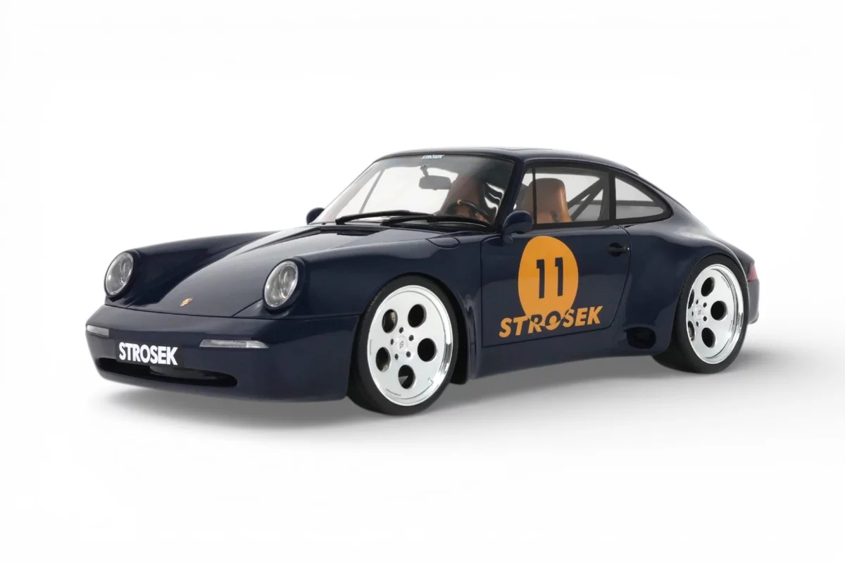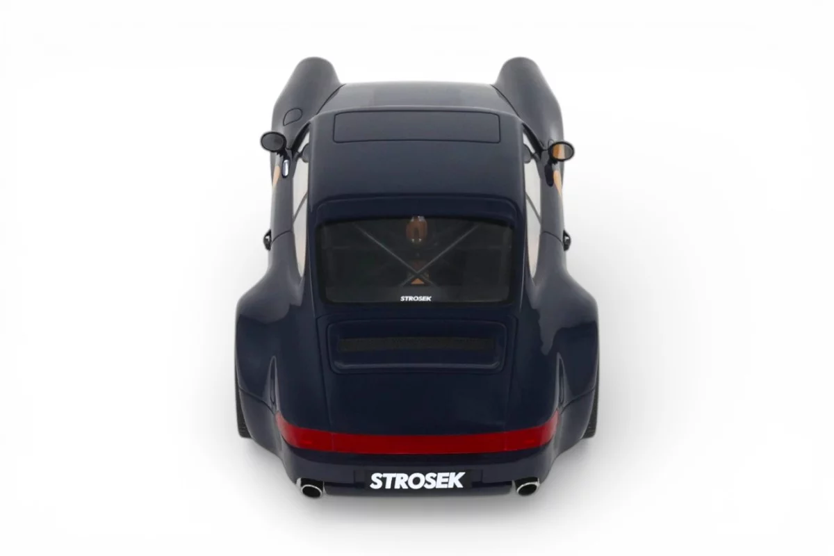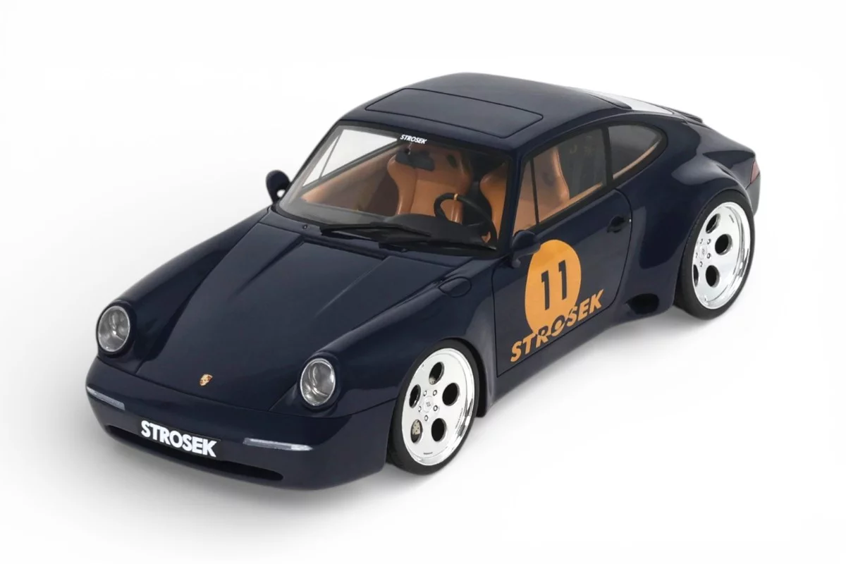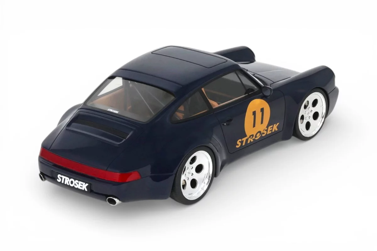 This 1:18 scale Strosek Mega 30 features blue livery. Crafted in resin by GT Spirit in limited series, it celebrates the return of German tuner Vittorio Strosek. Based on the Porsche 964, the Mega 30 marks the 30th anniversary of the original design and exists in only 30 examples, each vehicle requiring 1,200 to 1,500 hours of restoration.