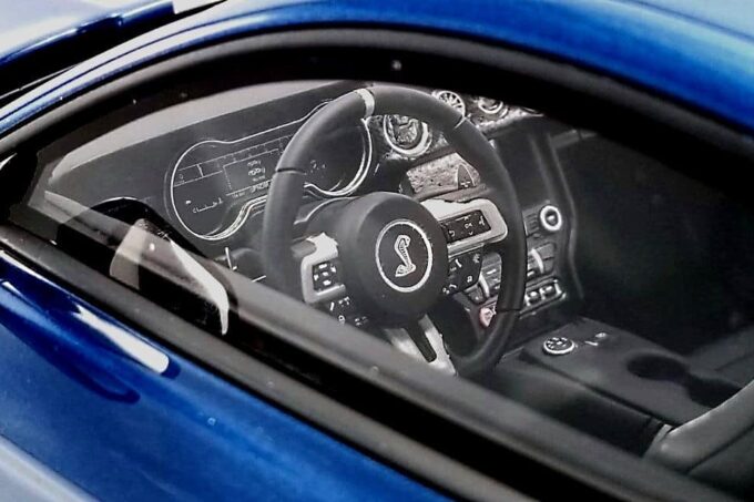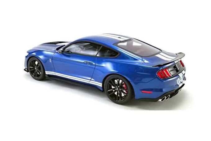 The Mustang Shelby GT500 is a legend among legends. This 1:12 scale model manufactured by GT Spirit perfectly reproduces the details of this car in its blue livery with white stripes. Limited production and numbered model.