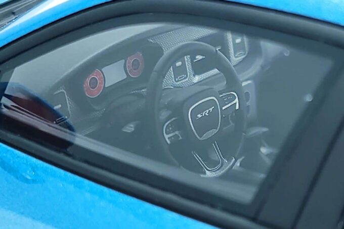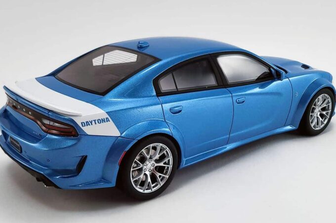 The Dodge Charger SRT Hellcat is here reproduced at 1:18 scale by the manufacturer GT Spirit in blue livery (Daytona 50th Anniversary edition). This resin model is made in very limited quantities.