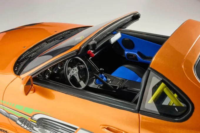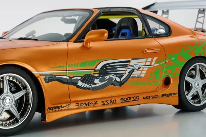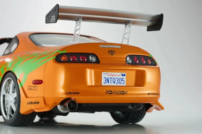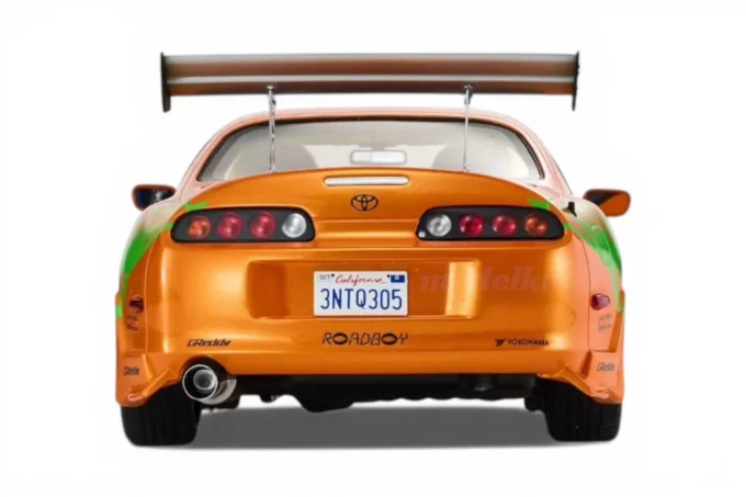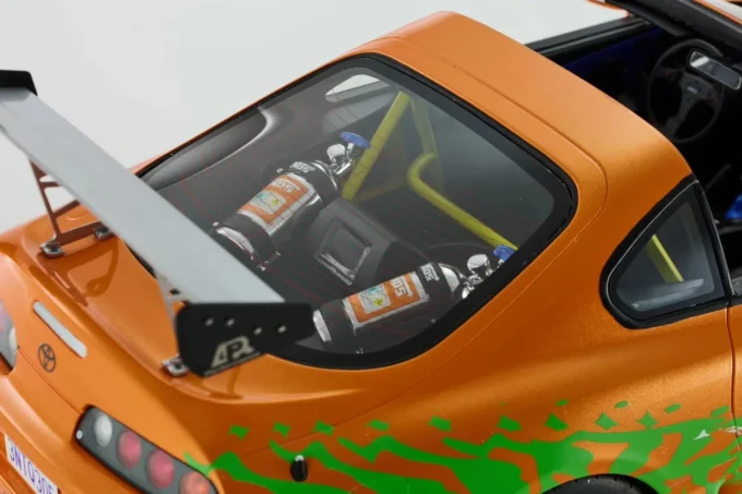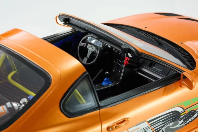 This 1:12 scale Toyota Supra Turbo Fast & Furious is crafted by Kyosho in resin, finished in Orange Pearl. It faithfully reproduces the livery and aerodynamic details of the movie car, and is produced in a limited run of 800 units. The Supra driven by Brian O'Conner in the first film of the franchise (2001) is an A80 powered by a 2JZ inline-six, an engine revered in global tuning culture for its ability to handle far greater power outputs than its factory rating without major structural modification.