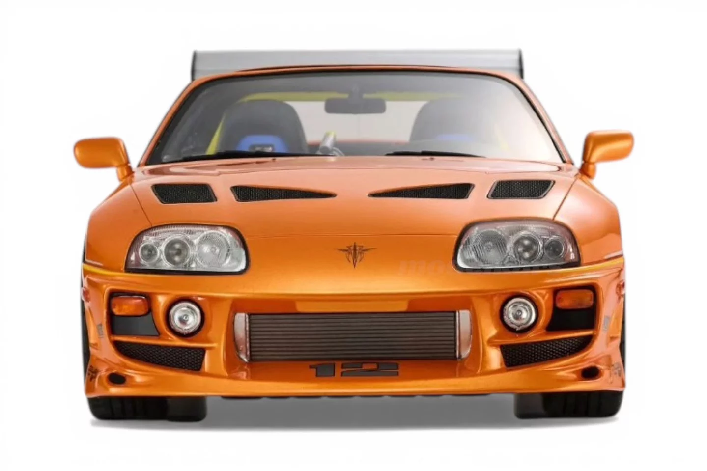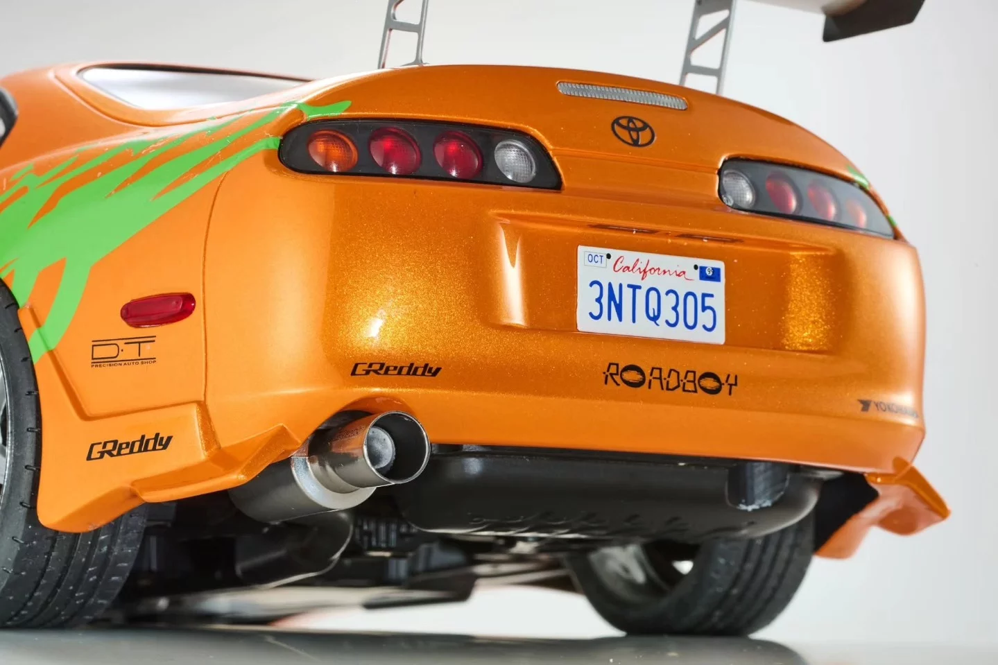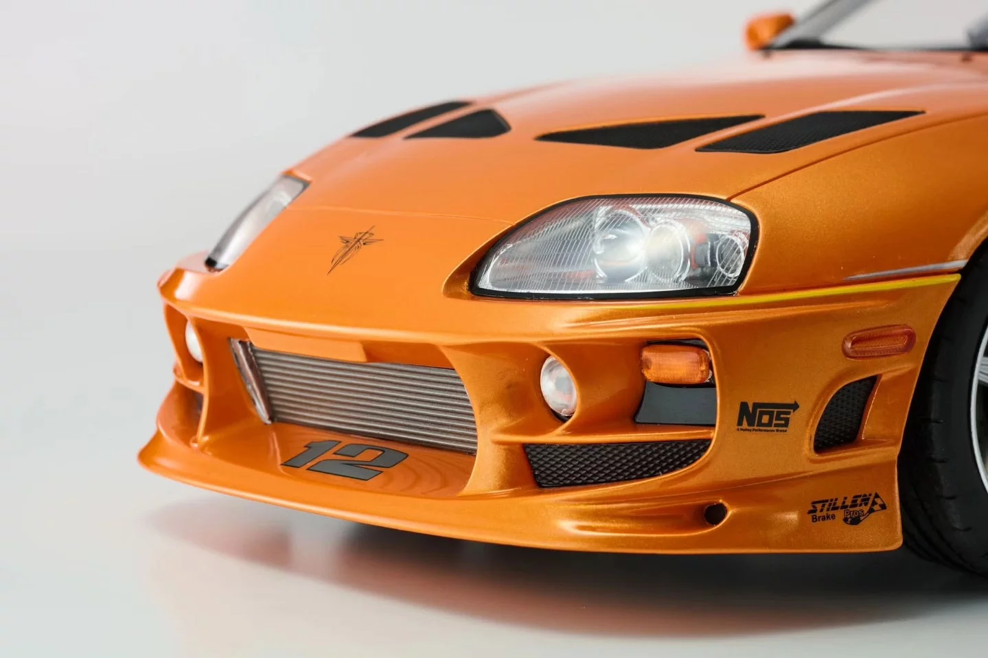 This 1:12 scale Toyota Supra Turbo Fast & Furious is crafted by Kyosho in resin, finished in Orange Pearl. It faithfully reproduces the livery and aerodynamic details of the movie car, and is produced in a limited run of 800 units. The Supra driven by Brian O'Conner in the first film of the franchise (2001) is an A80 powered by a 2JZ inline-six, an engine revered in global tuning culture for its ability to handle far greater power outputs than its factory rating without major structural modification.