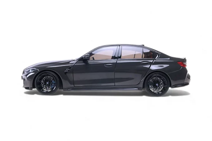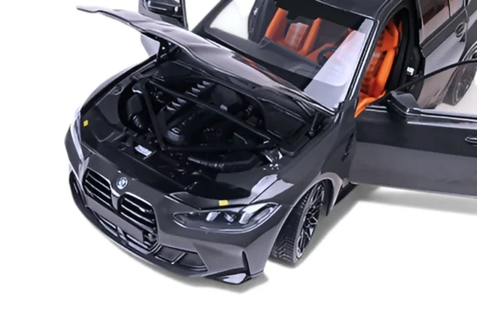 This 1:18 scale BMW M3 (G80) by Minichamps showcases a grey metallic color. Made of metal and limited in production, it features opening parts and a display base. The real M3 G80 blends performance and versatility with its optional all-wheel drive.