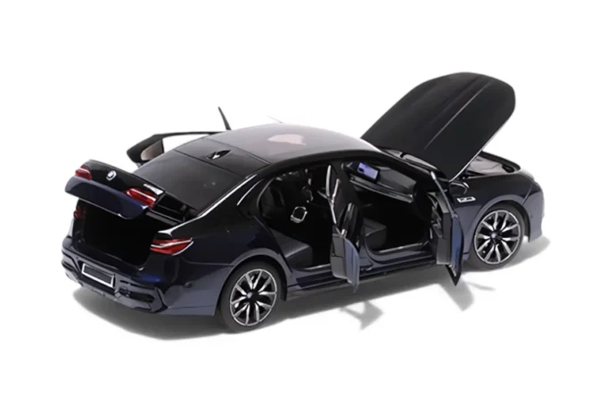 This 1:18th scale model car reproduces the BMW i7 M70 (G70) in a blue/black color. Manufactured by Minichamps, this model is made of metal. Some parts are opening. Miniature produced in limited series.
