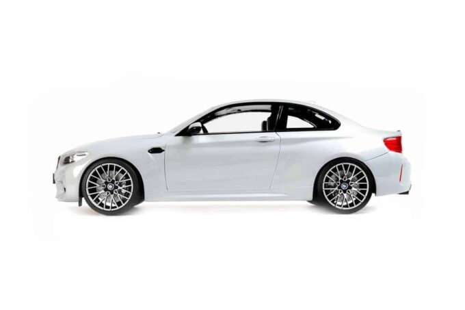 The BMW M2 Competition is a small German sports car with 410 horsepower on the rear wheels: everything you need for fun! It is here reproduced by Minichamps in 1:18 scale in a silver gray livery.