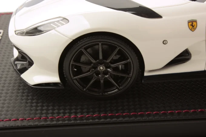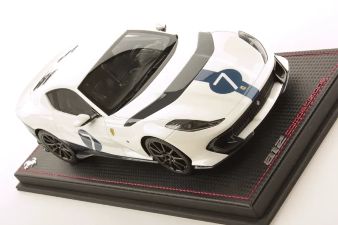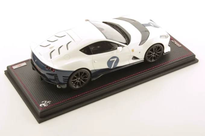This 1:18 scale Ferrari 812 Competizione features an exceptional Bianco Italia livery with Blu Nart stripes and number 7. Crafted in resin by MR Collection, this edition limited to 49 examples is presented on a refined base with display case. This unique color combination evokes the spirit of historic Ferrari competition cars.