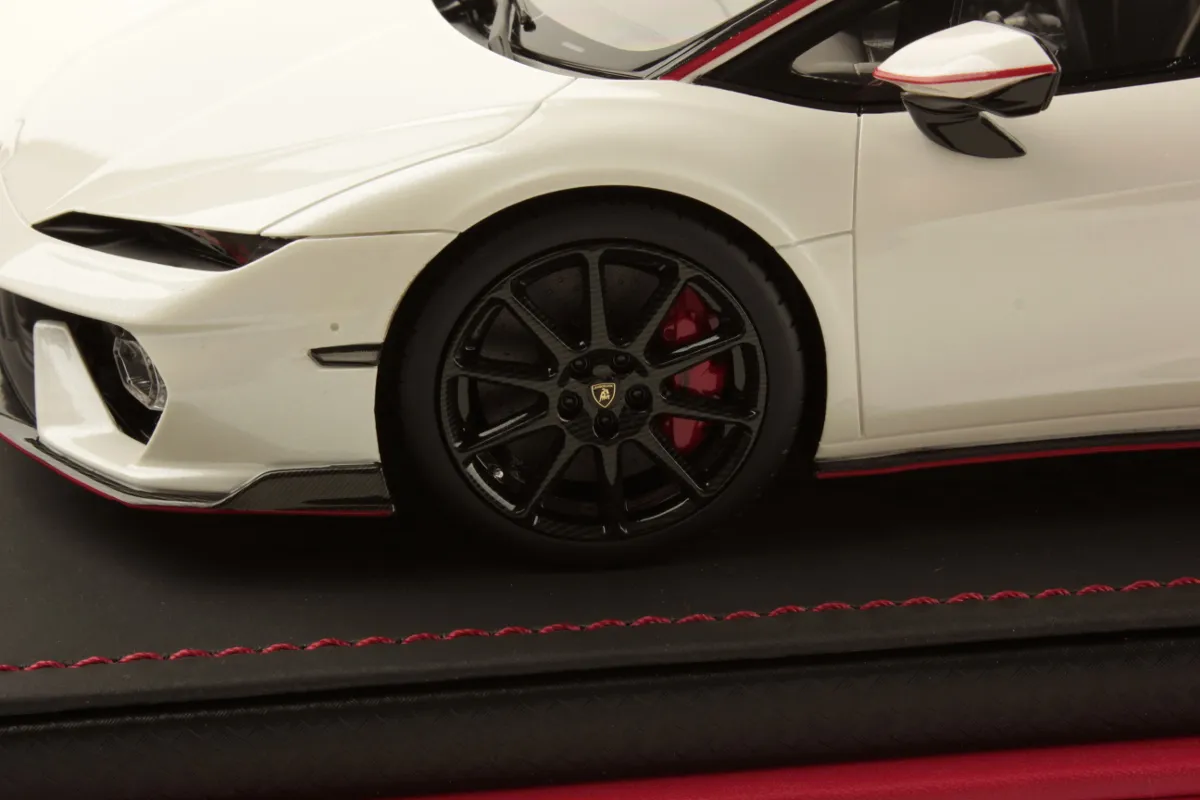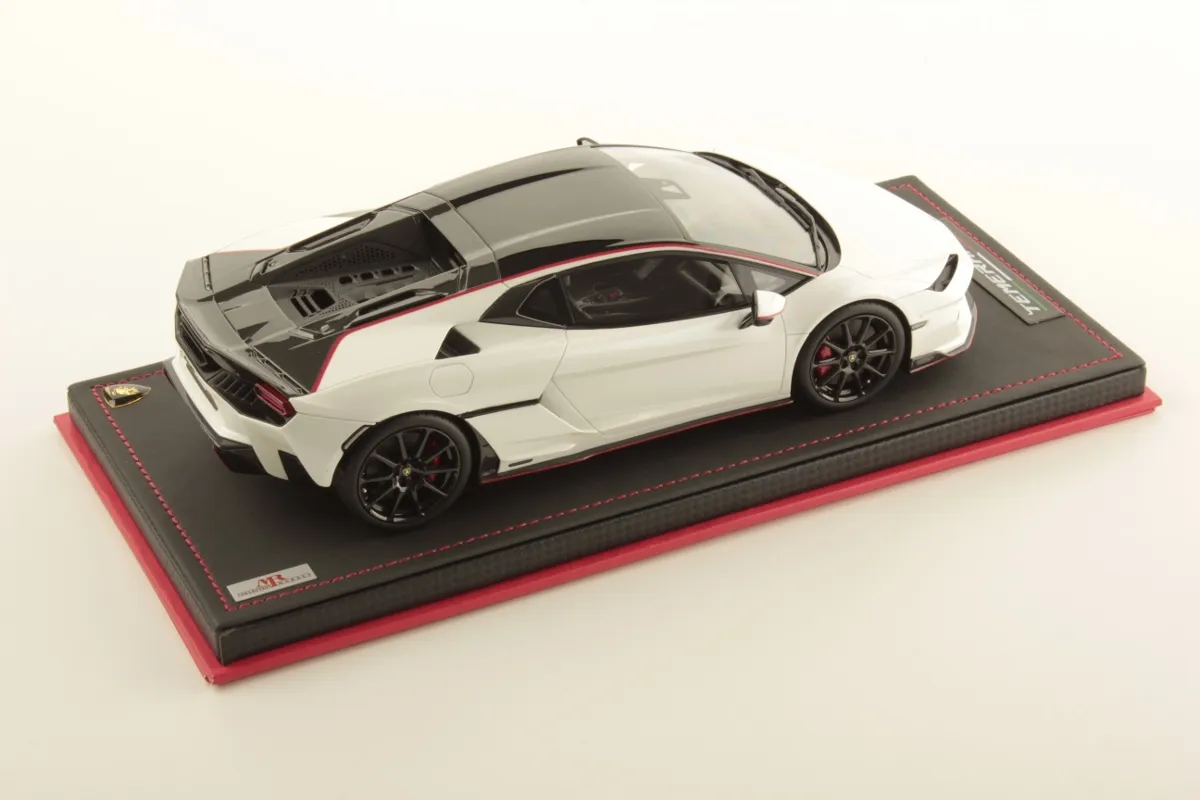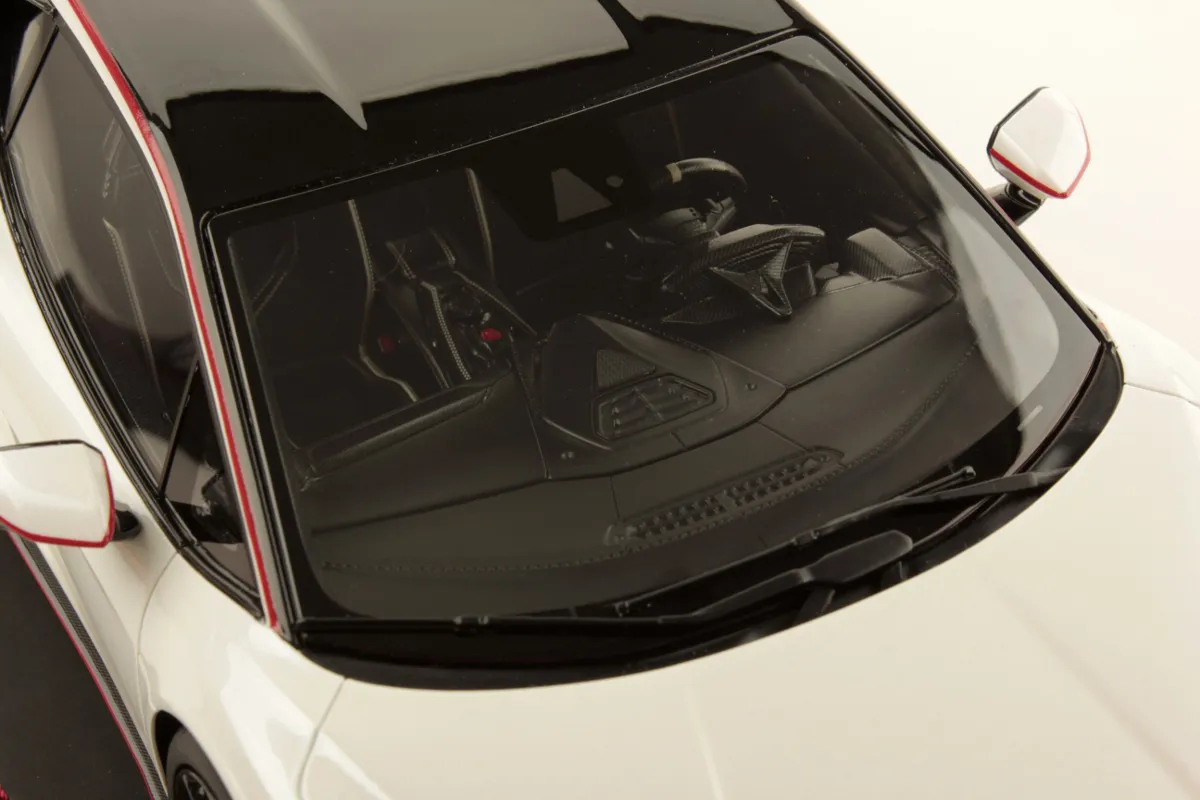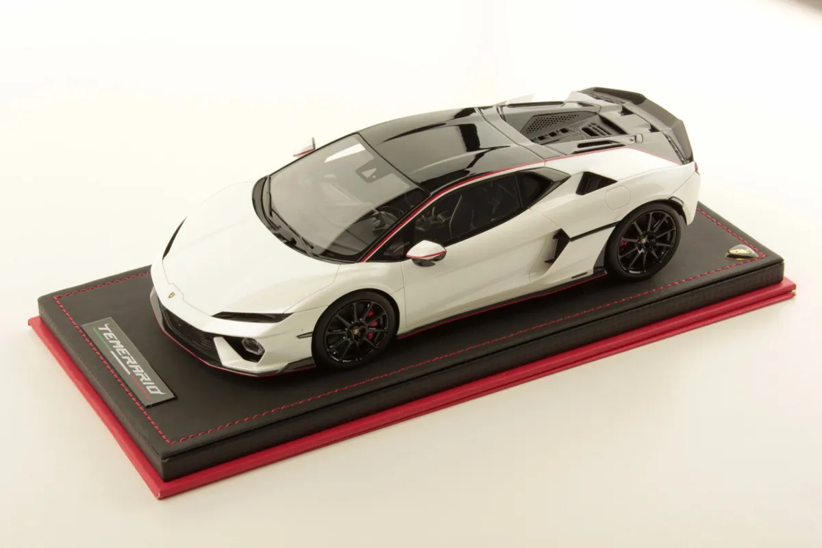 The Lamborghini Temerario Alleggerita in Balloon white, reproduced in 1:18 scale by MR Collection, is a finely detailed resin model. A limited edition with a base and showcase, this miniature embodies the pursuit of lightness and agility, the hallmark of the Alleggerita Package.