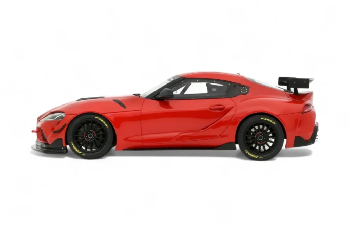 This 1:18th scale model car reproduces the Toyota GR Supra GT4 "100 Edition" in a Plasma Orange livery. Manufactured by OttOmobile, this scale model is made of resin. This model is produced in a limited series.