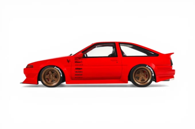 This 1:18 scale Toyota AE86 Sprinter Trueno Widebody is crafted by OttOmobile in resin. It wears the Rosso Corsa finish, Ferrari's legendary competition red.