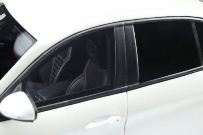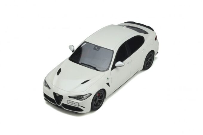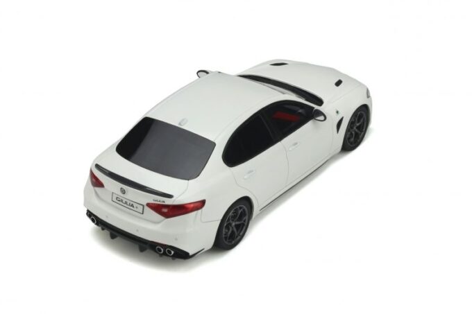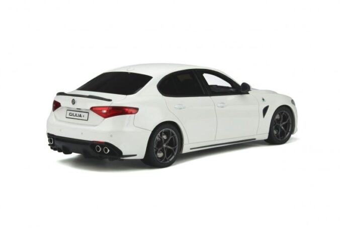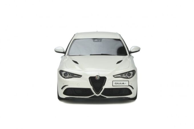 Made in 1:18 scale by OttOmobile, this superb Italian sedan is the most powerful Alfa Romeo ever produced. The Giulia Quadrifoglio is here reproduced in its white livery and black rims. A model car produced only 2500 copies each one is numbered under the body.