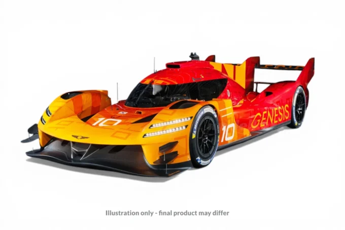 This 1:18 scale Genesis GMR-001 is crafted by Spark in resin, finished in orange. It represents the LMDh prototype developed by Genesis Magma Racing in partnership with Oreca, set to compete in the FIA World Endurance Championship from 2026. The model is produced in a limited series and comes on a base under a display case.