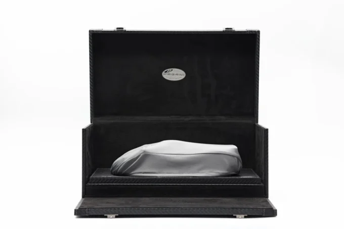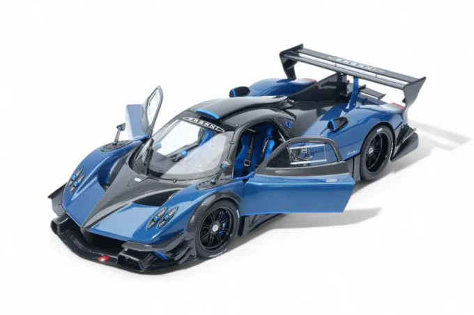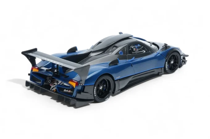 This 1:18 scale miniature car reproduces the Pagani Zonda Revolución in a blue and carbon fiber color scheme. A BBR model produced in collaboration with Almost Real. Features working suspension. Comes on a premium base, with a display case and high-end presentation box included. Includes a transparent display case. Some parts open. Limited edition.