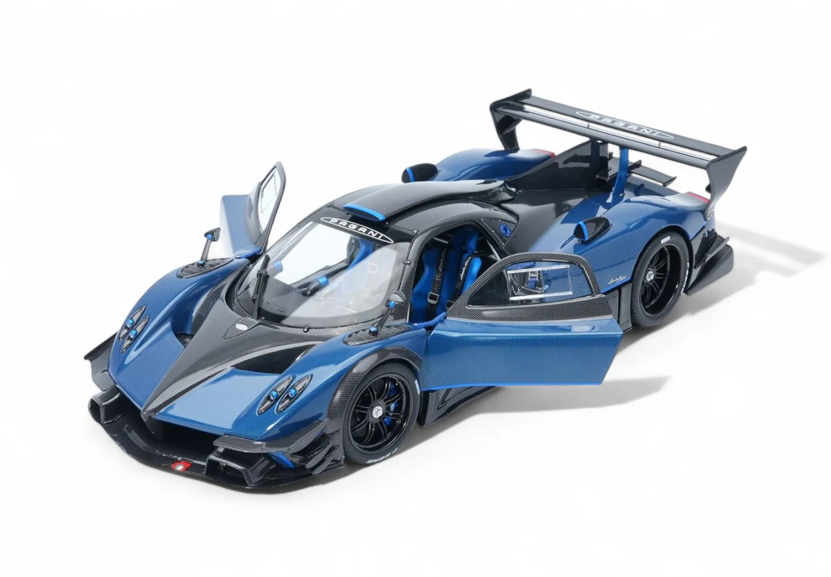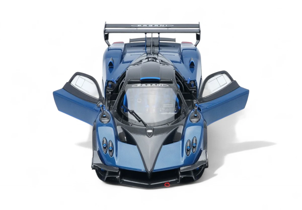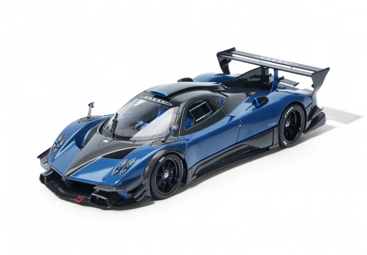 This 1:18 scale miniature car reproduces the Pagani Zonda Revolución in a blue and carbon fiber color scheme. A BBR model produced in collaboration with Almost Real. Features working suspension. Comes on a premium base, with a display case and high-end presentation box included. Includes a transparent display case. Some parts open. Limited edition.