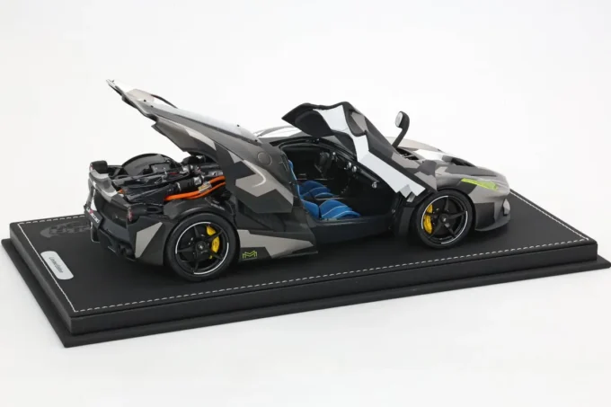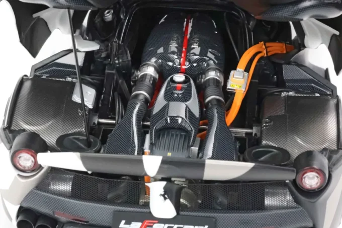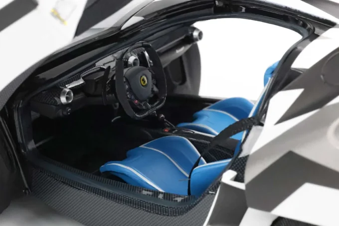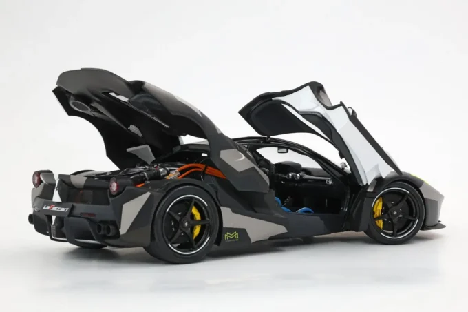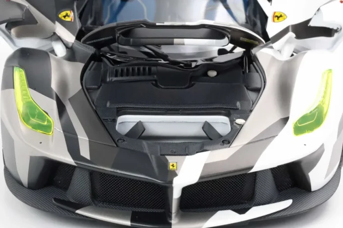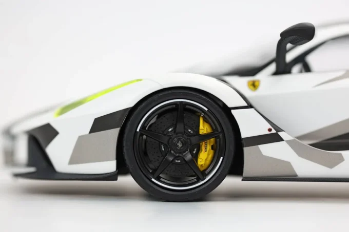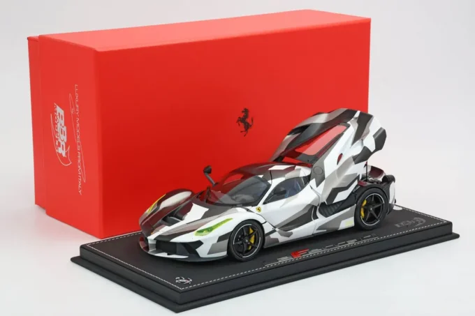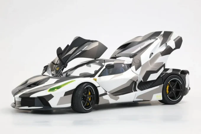 The Ferrari LaFerrari in 1:18 scale in white and grey camouflage is an exceptional limited edition by BBR. It is Ferrari's first hybrid hypercar, combining a V12 engine and an electric motor for impressive power. Made of metal, this miniature, limited to only 100 pieces, features opening parts, a display base, and a showcase.