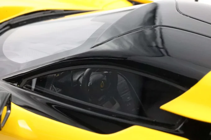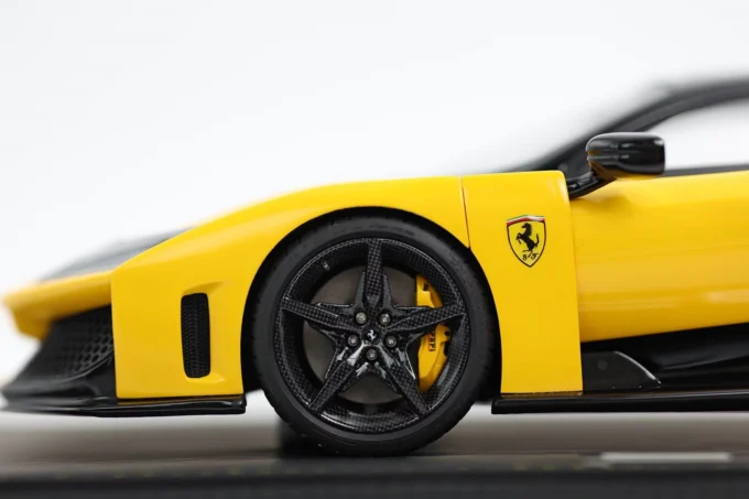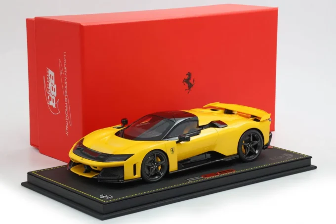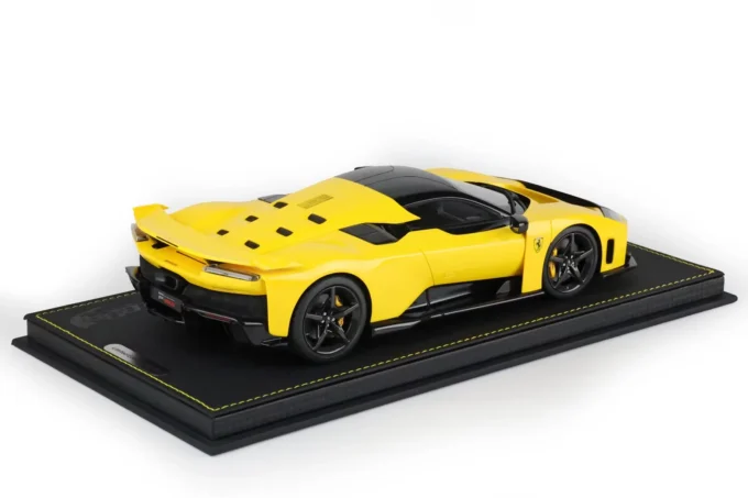 This Ferrari F80 in Modena Yellow with carbon wheels is a 1:18 resin model, mounted on a base and crafted by BBR. Limited in production to celebrate Ferrari's 80th anniversary, this 1200-horsepower hybrid supercar is already a legend, with only 799 units produced.