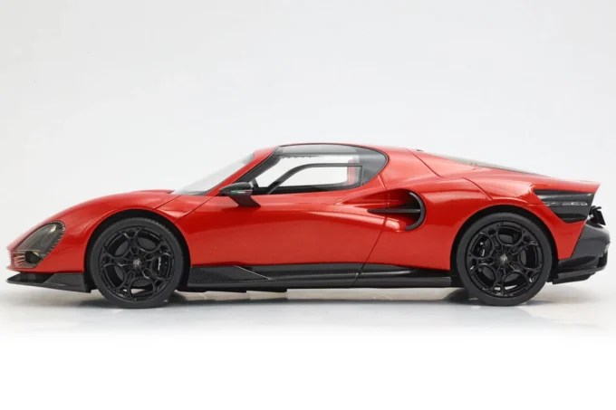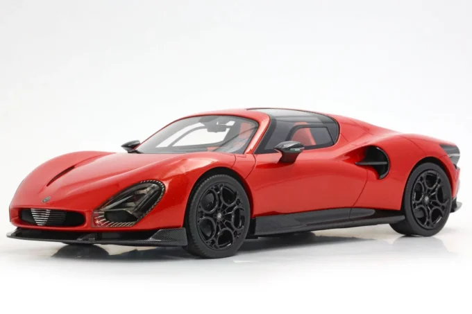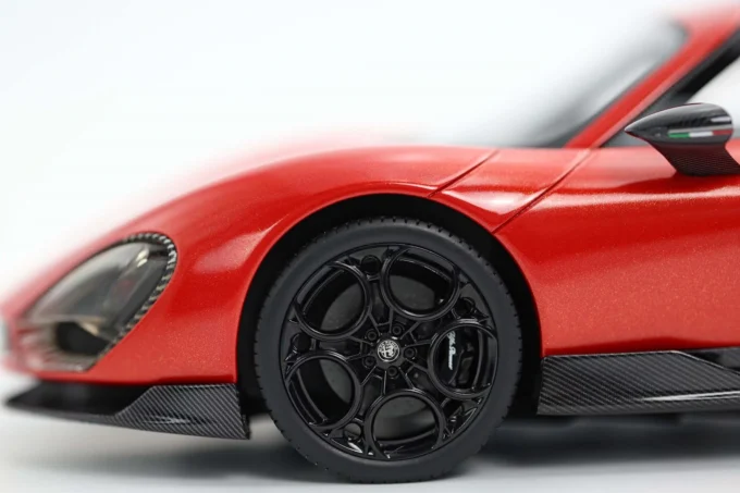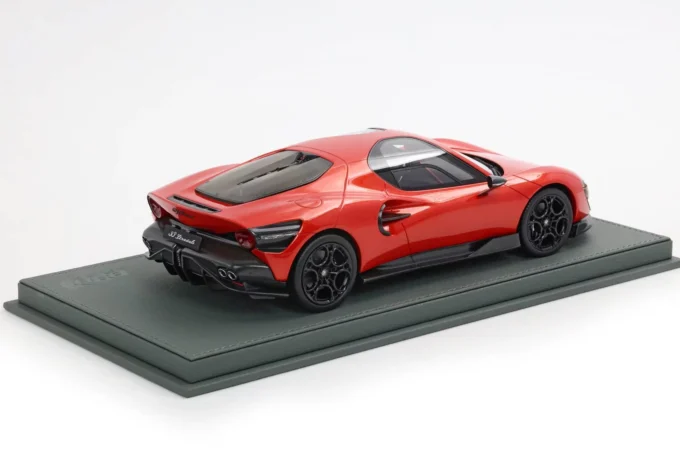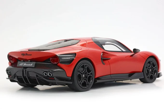 This 1:18 scale Alfa Romeo 33 Stradale miniature radiates in its Arancione orange finish, a color that emphasizes the bold character of this modern hypercar. Shaped by BBR in resin and delivered with its elegant base, it immortalizes a vehicle whose hybrid V6 engine develops phenomenal power. The contemporary 33 Stradale perpetuates the legacy of a model considered one of the most beautiful automobiles ever created.