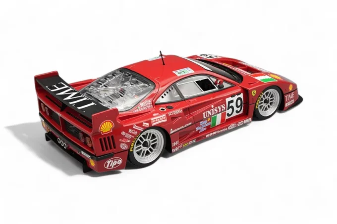 This 1:18 scale Ferrari F40 LM reproduces the #59 entered at the 1996 Le Mans 24 Hours by Team Ennea SRL. Crafted in resin by Tecnomodel, it displays the red and white livery with a removable rear hood providing access to the twin-turbo V8 engine. Delivered with base and display case, this limited miniature honors the Nappi/Oota/Donovan crew.