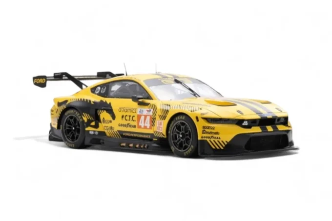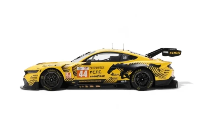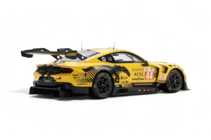 This 1:18 scale Ford Mustang GT3 #44 immortalizes the entry of the American icon at Le Mans in 2024. Crafted by Spark in resin, it reproduces the yellow with black stripes Proton Competition livery of Hartshorne, Tuck and Mies. This limited series miniature, presented with base and display case, commemorates the remarkable debut of the Mustang GT3 which immediately showed its potential by finishing fourth in its category, powered by its 5.4-liter naturally aspirated V8.