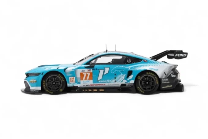 This 1:18 reproduction of the Ford Mustang GT3 #77 captures the essence of the American muscle car. Manufactured by Spark in resin with remarkable precision, it displays the blue Proton Competition decoration of Barker, Hardwick and Robichon from the 2024 24 Hours of Le Mans. Delivered with base and display case, this limited series pays tribute to a formidable competitor.